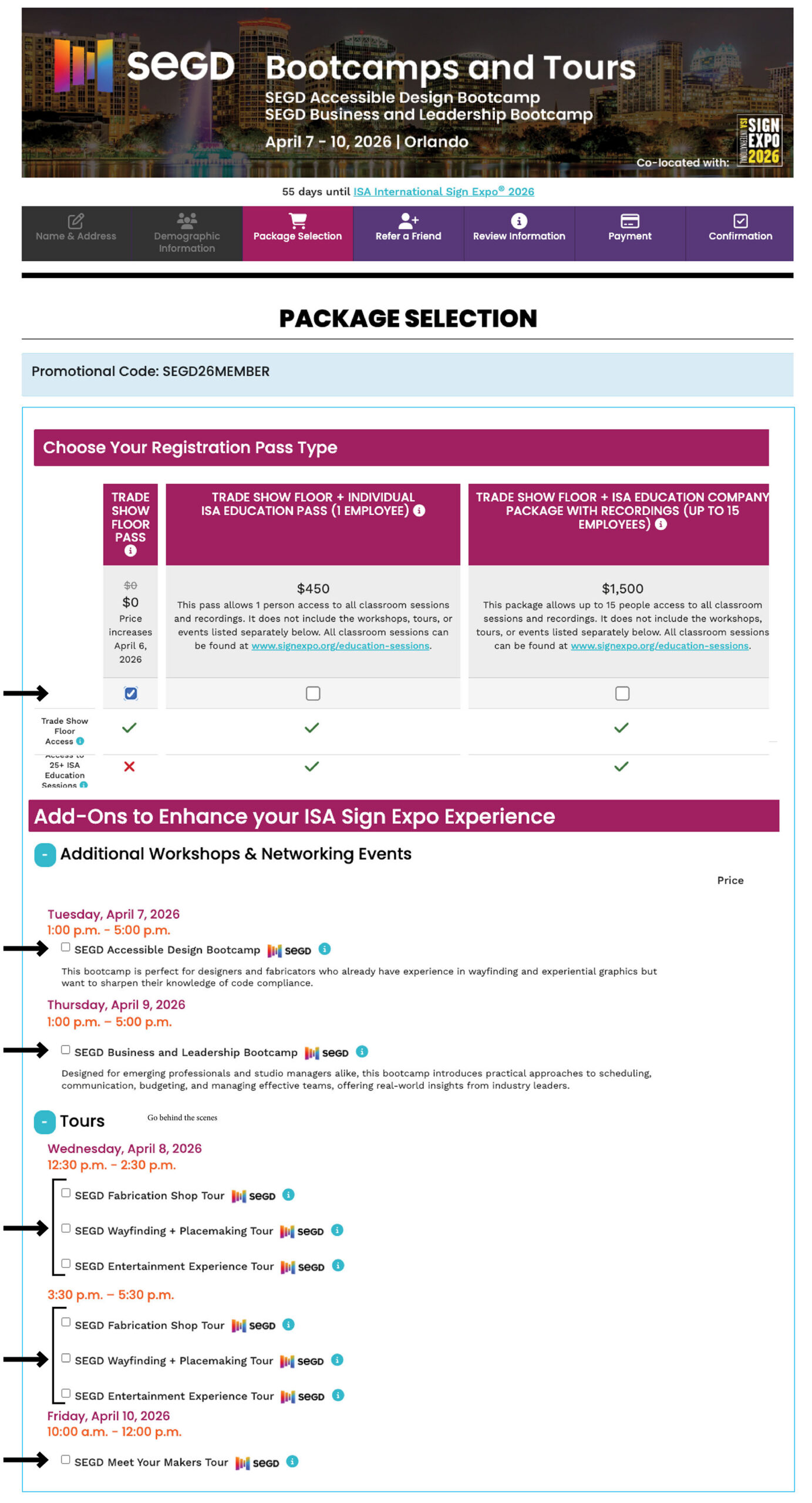 Select the ISA TRADE SHOW FLOOR then select your choice of SEGD BOOTCAMPS AND TOURS listed in the ISA REGISTRATION.