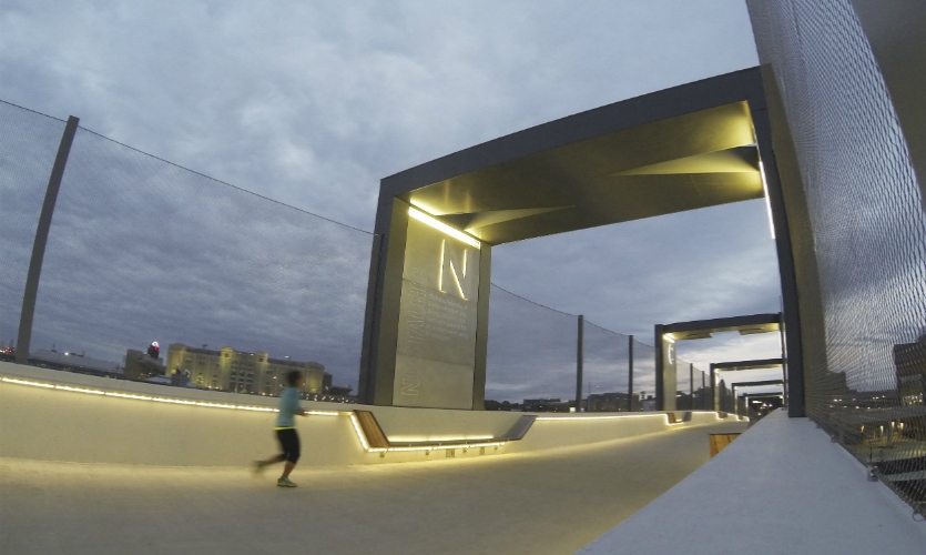 This project successfully transforms a mundane pedestrian bridge into an actual landmark that effectively communicates on various scales: from the aerial view to ground transportation to the pedestrian level. At nighttime, the illuminated arches and integrated benches create a sense of virtual space that is at the same time open to the elements and visually enclosed—a highly successful example of public placemaking.