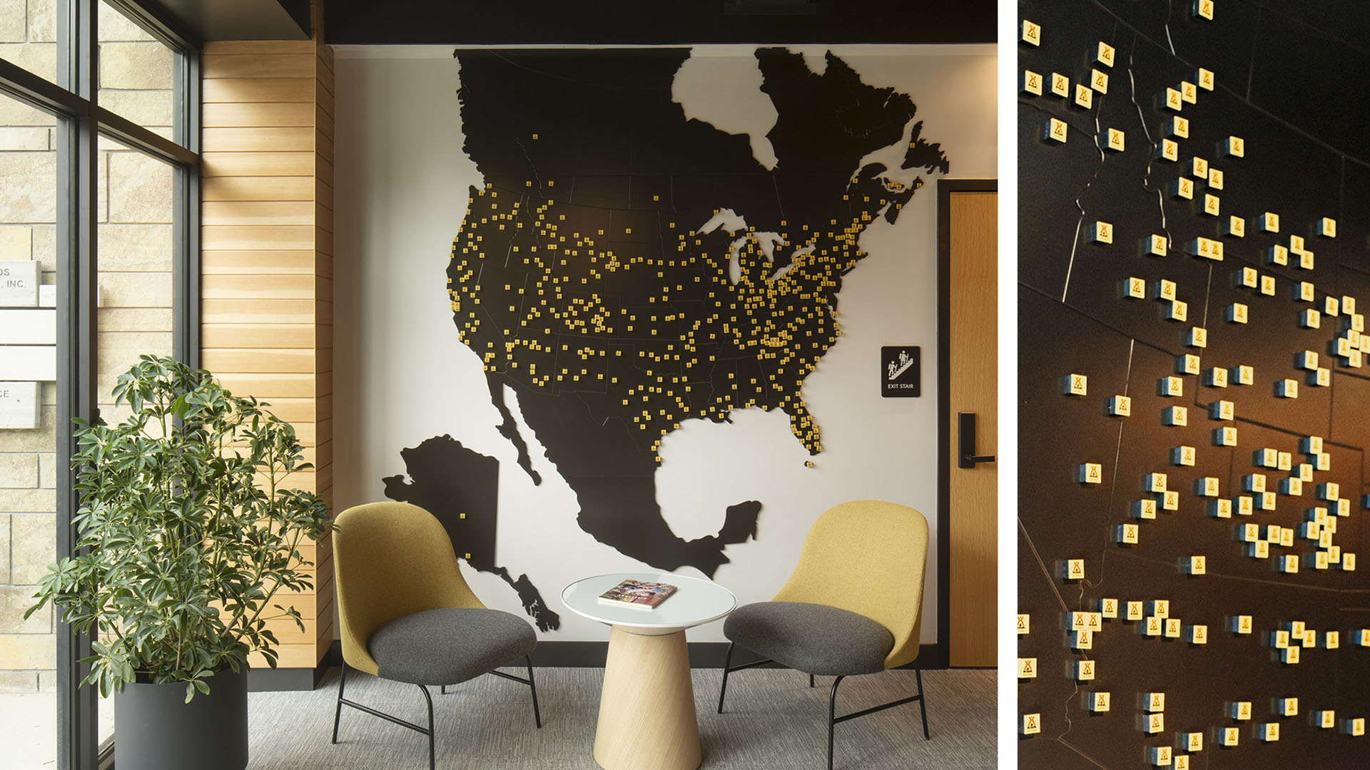 Brand storytelling is central to the design, with subtle yet expansive experiential graphic design (EGD) that runs throughout the project. A two-story rope wall made from climbing ropes knotted into KOA’s logo acts as a tactile, visual centerpiece, embodying the brand’s ethos of exploration and resilience. The egress stairwell features 360° illustrations of Montana’s iconic rivers, trails, and mountains, while physical trail markers offer moments of reflection and interaction. The art collection features works by regional and Indigenous artists and grounds the space in its cultural context. Conference rooms are energized with distraction graphics that highlight KOA’s camping experiences, and even functional details, such as code signage, are designed with subtle nods to the brand’s playful identity. In the main corridor, a tactile steel map wall showcases KOA’s national reach, emphasizing the values of connection, community, and exploration that define the organization.