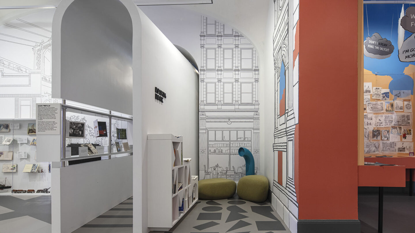 Gallery 1: Building Readers, explores a child’s first experience where shapes, forms, imagery, and words become building blocks of language and the built environment. This gallery shows how the presentation of a story can be influenced by aspects of a book’s physical design and construction. The parallels between the design of books and the design of buildings are revealed, particularly how scale and construction impacts our experience of both. Visitors are invited to consider the process of building and that of book-making through a selection of rare book dummies, original sketches, and architectural models.