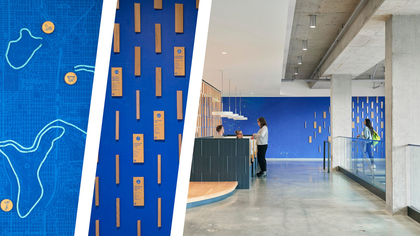 In an open atrium, fine linework murals show landmarks in the Fremont neighborhood. Floor graphics form a topographic map of surrounding land and waterways.
