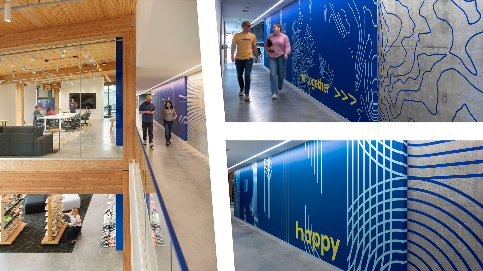 The building itself encourages movement with graphic interventions located not just in large gathering spaces or work areas, but in the corridors, byways, and stairs. The smallest of details are all relevant to the community culture, product materials, company history, and local landscapes, but the bigger picture highlights the vibrant, fun, and energetic spirit that can only belong to Brooks.