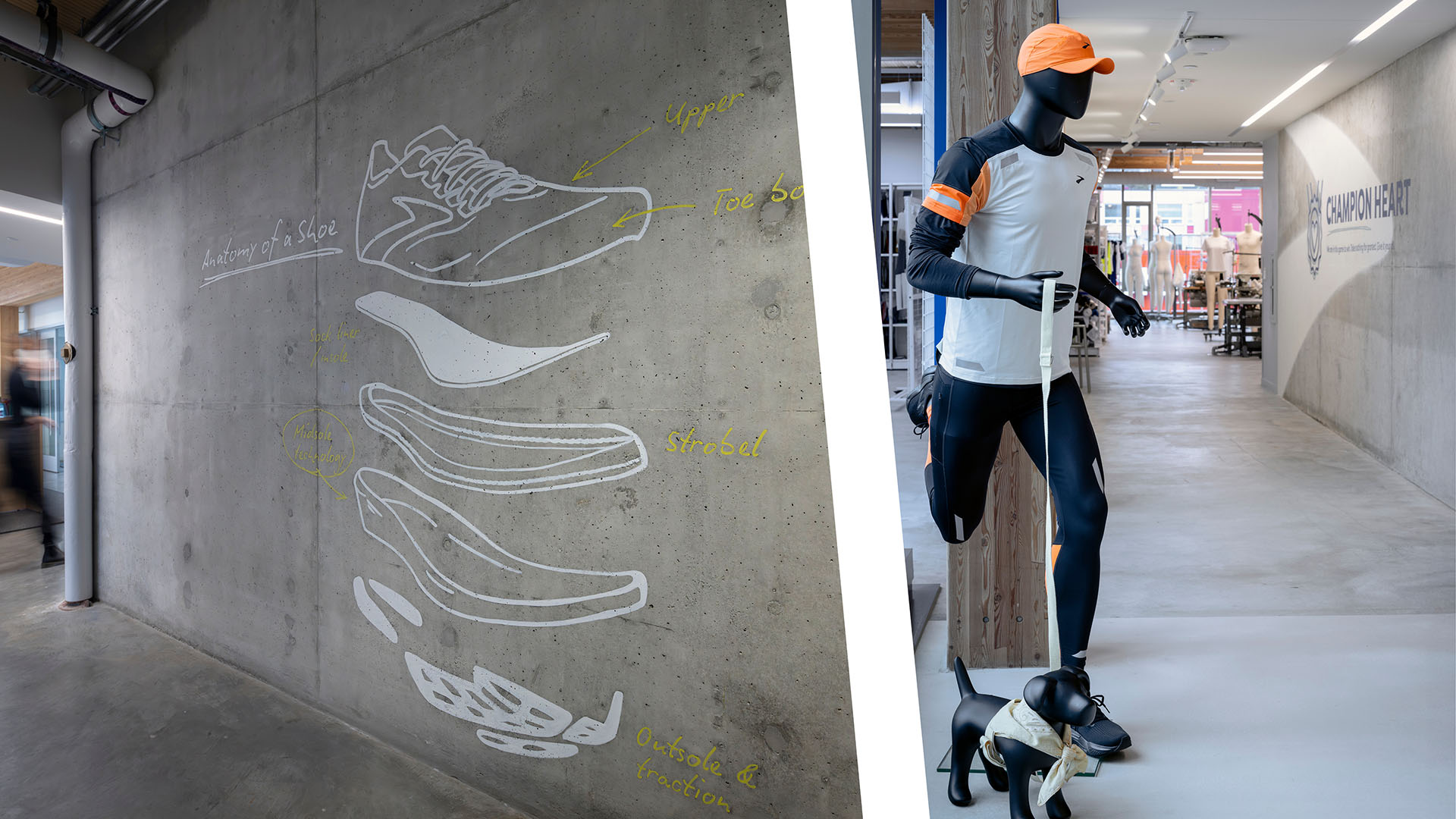 Linework patterns representing elevation, speed, and running tracks seamlessly cross from print into stencil paint on the concrete walls. In other hallway areas, the stencil painting continues, touting technical innovations and fundamental knowledge such as the anatomy of a shoe.