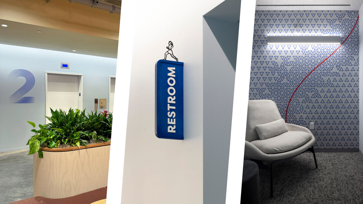 Respite and wellness rooms have unique custom patterns pulled from performance fabrics and shoe treads, printed onto acoustic sound panels made of recycled polyester felt. The restroom signs incorporate running figures as a nod to identity signs at the original headquarters building. Identifiers in elevator lobbies are custom numbers inspired by the motion of a track sprint.