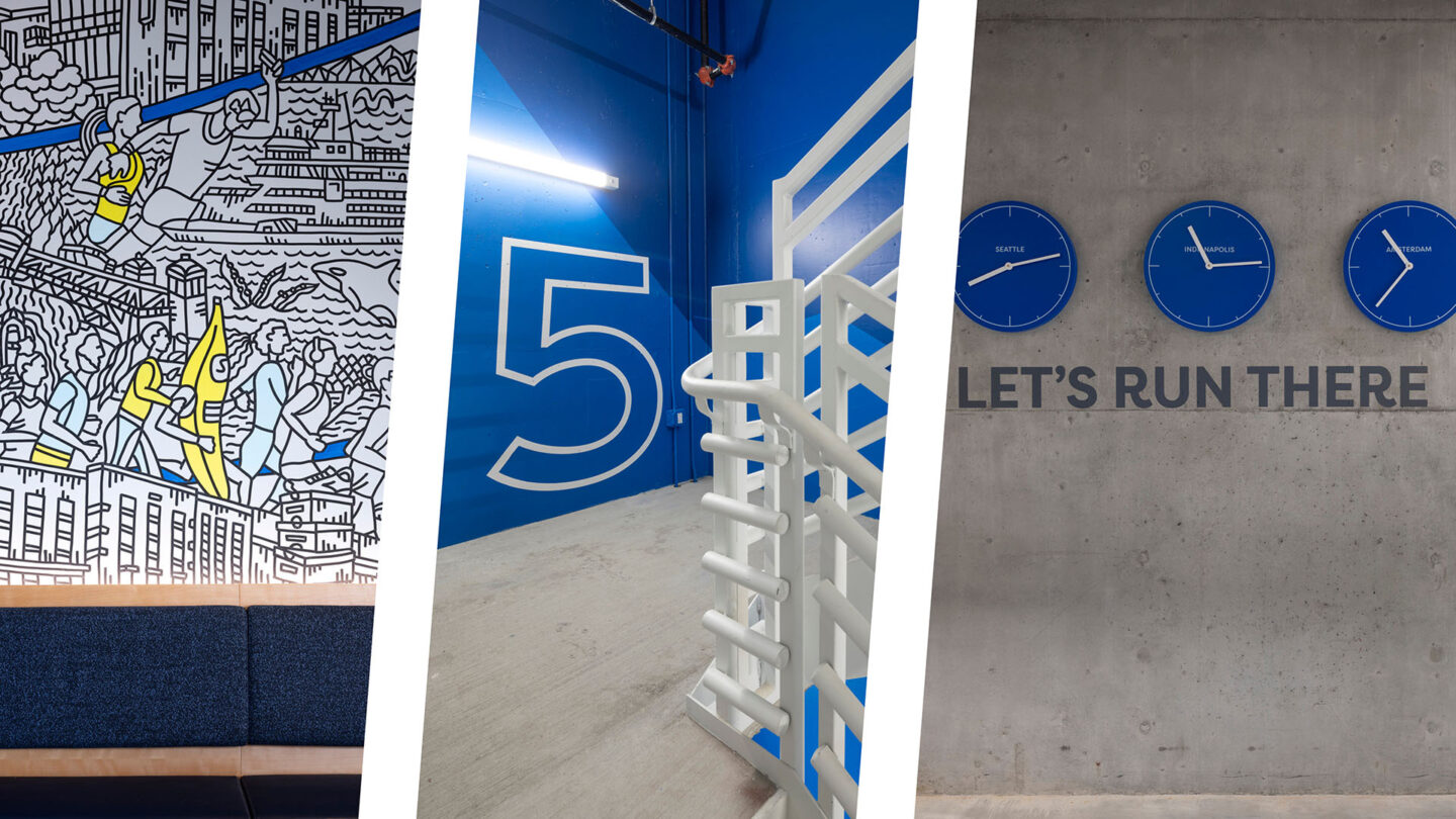 A custom mural from Shogo Ota highlights running culture. Geometric stairwells abstract the peaks and valleys of a run. Global clocks feature five Brooks offices around the world.