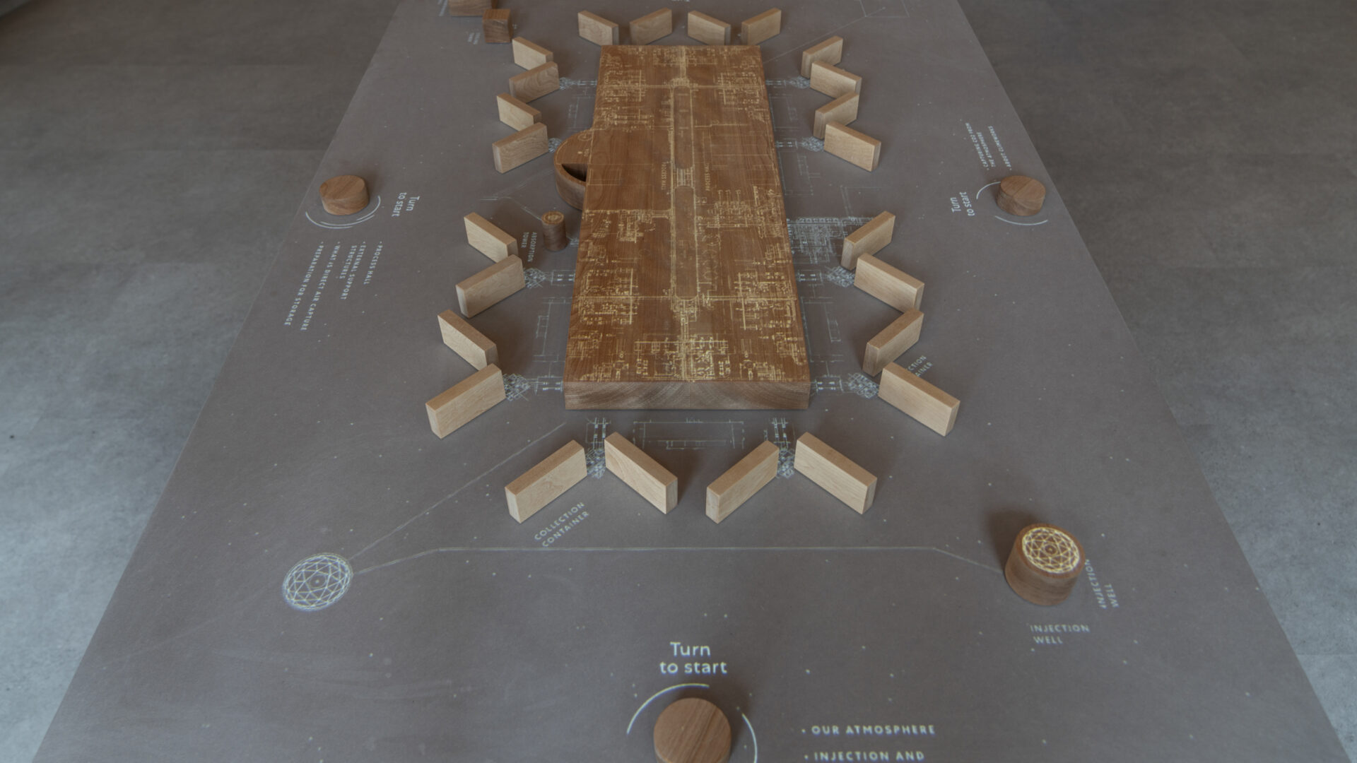 Turning a knob illuminates parts of a semi-transparent image projected on top of the model, highlighting the intricate network of pipes and facilities where CO₂ flows. This interactive experience allows visitors to follow the journey of CO₂ through different stages, with text and illustrations appearing to explain each step. These visual elements make the complex scientific processes accessible and engaging, encouraging a deeper understanding and connection to the technology.