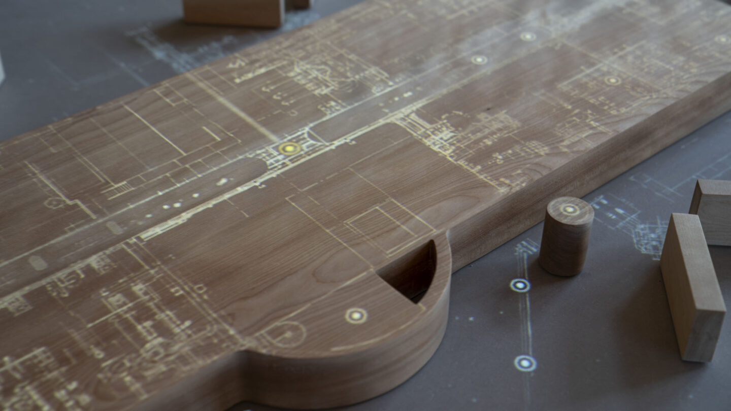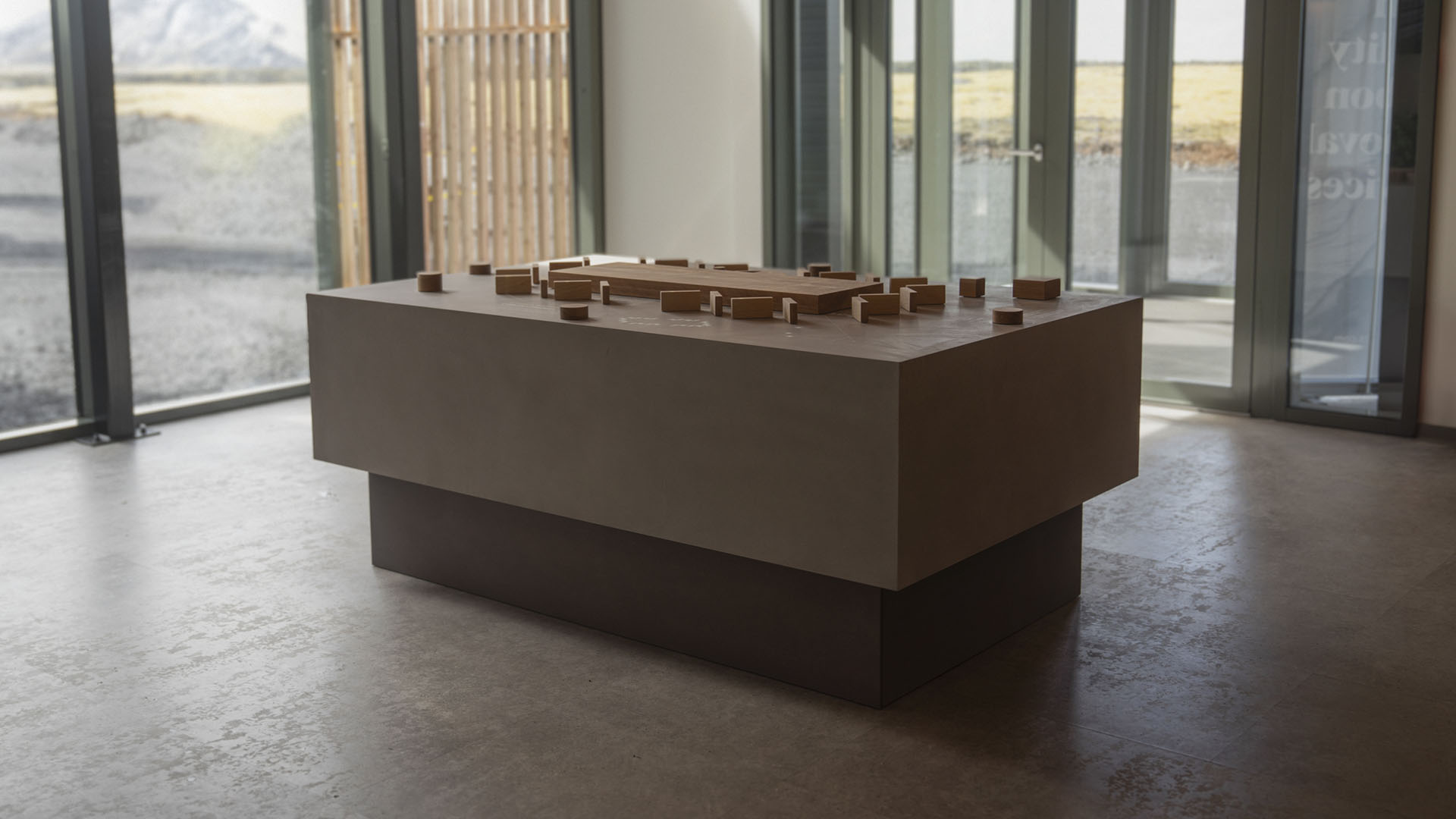 The table’s construction consists of two materials. The concrete like unit is made of Valchromat® MDF plates. Valchromat® is considered environmentally friendly because it is made from sustainable wood fibres, free from harmful chemicals, and designed for recyclability and low environmental impact. The model and knobs are made of birchwood, one of the few endemic trees natural to the environment in Iceland. Furthermore the installation was made by local producers ensuring short travel distances. The whole installation runs on 100% renewable energy.
