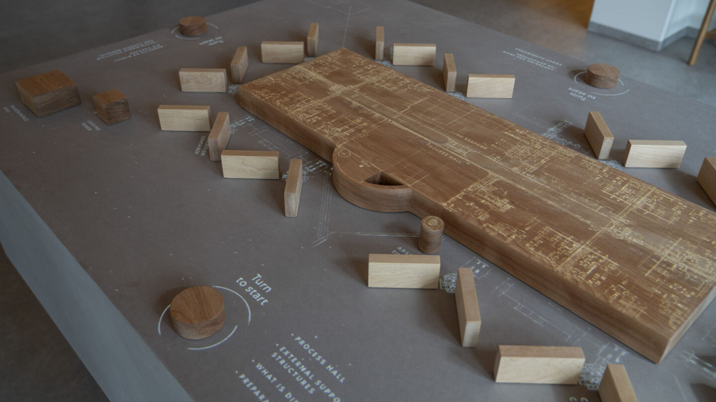 Even when not in active use, the model remains an attraction with a meditative feel. Particles flow from the edges towards the air-capturing center, and the names of each building are highlighted. The interactive design, with its animated circles around the birch knobs, draws visitors in and entices them to interact with the exhibit.
