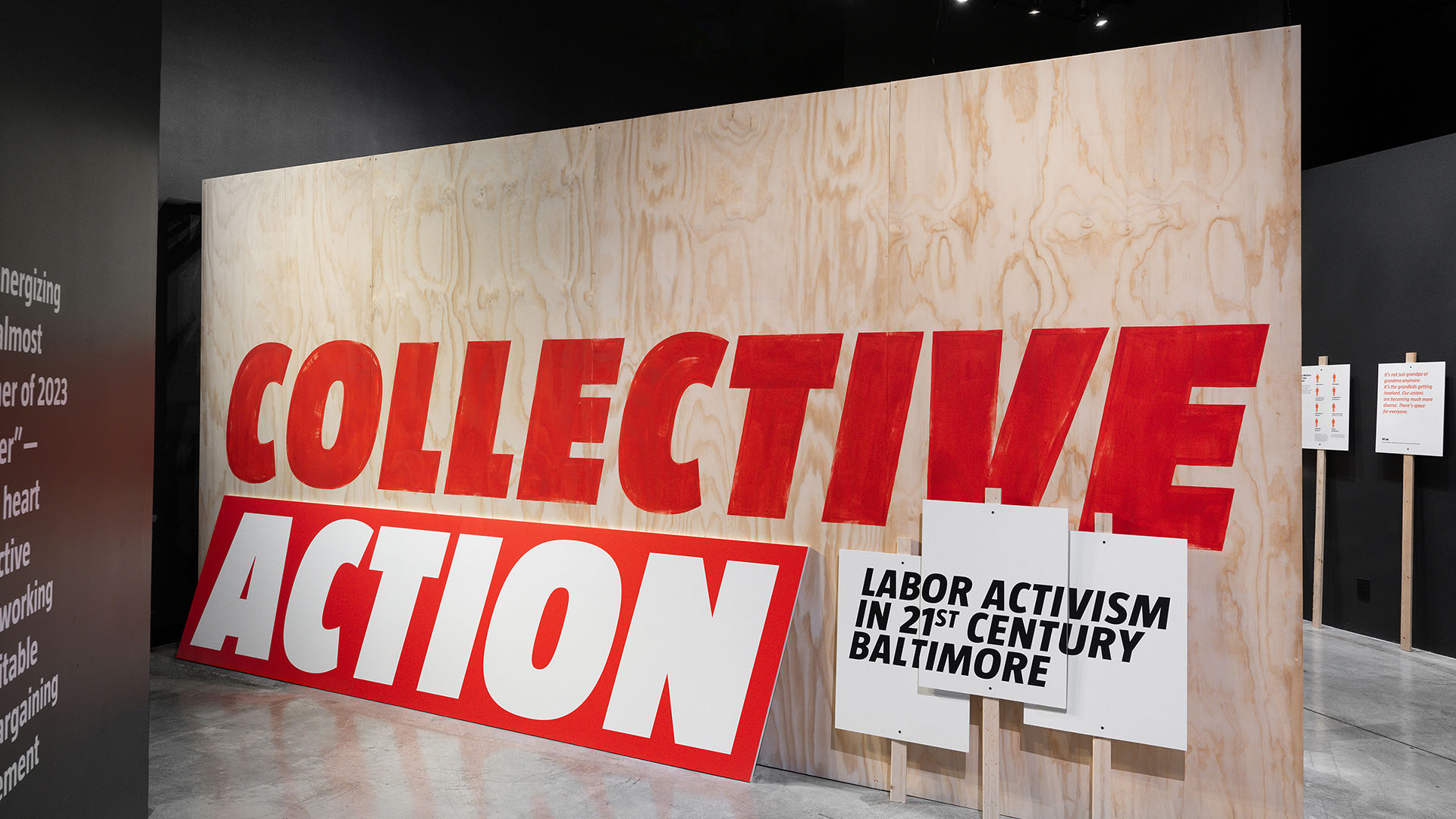 Labor’s roll-up-your-sleeves spirit was on immediate display at the entrance, where an unvarnished plywood wall with hand-painted lettering greeted visitors. Overlapping picket signs completed the exhibition’s title.
