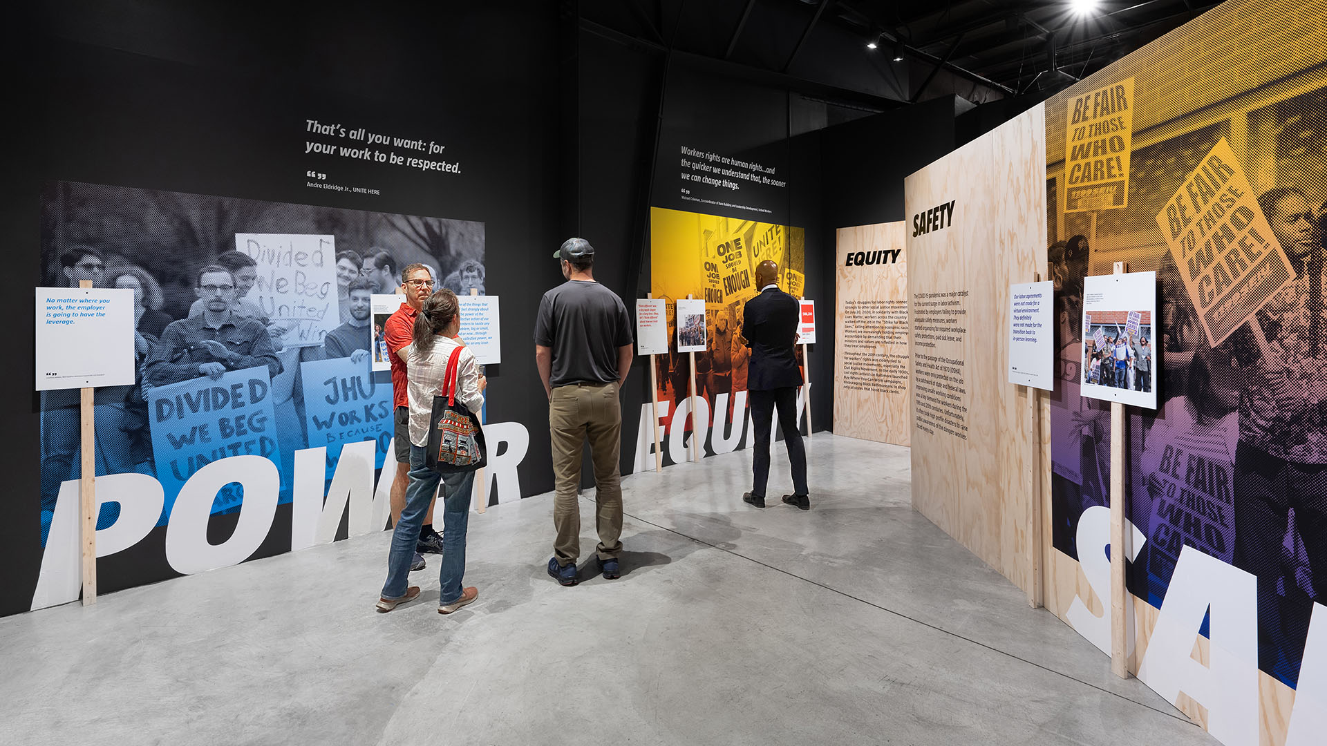 The exhibit focused on five themes: Wages, Equity, Power, Safety, and Change. Each section was anchored by a large wall mural, where photography was rendered in true-to-life scale, inviting visitors to stand in with the advocacy groups. Stylizing the imagery with a halftone pattern made it possible to scale low-quality and low-resolution photos captured by participants and observers to large sizes.