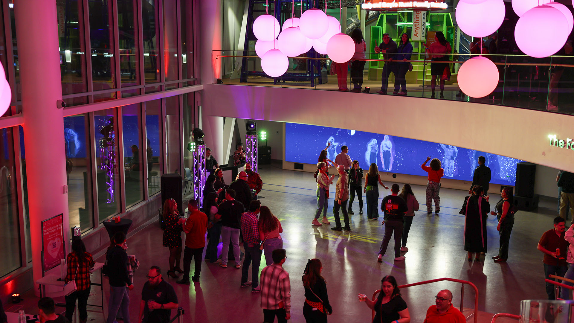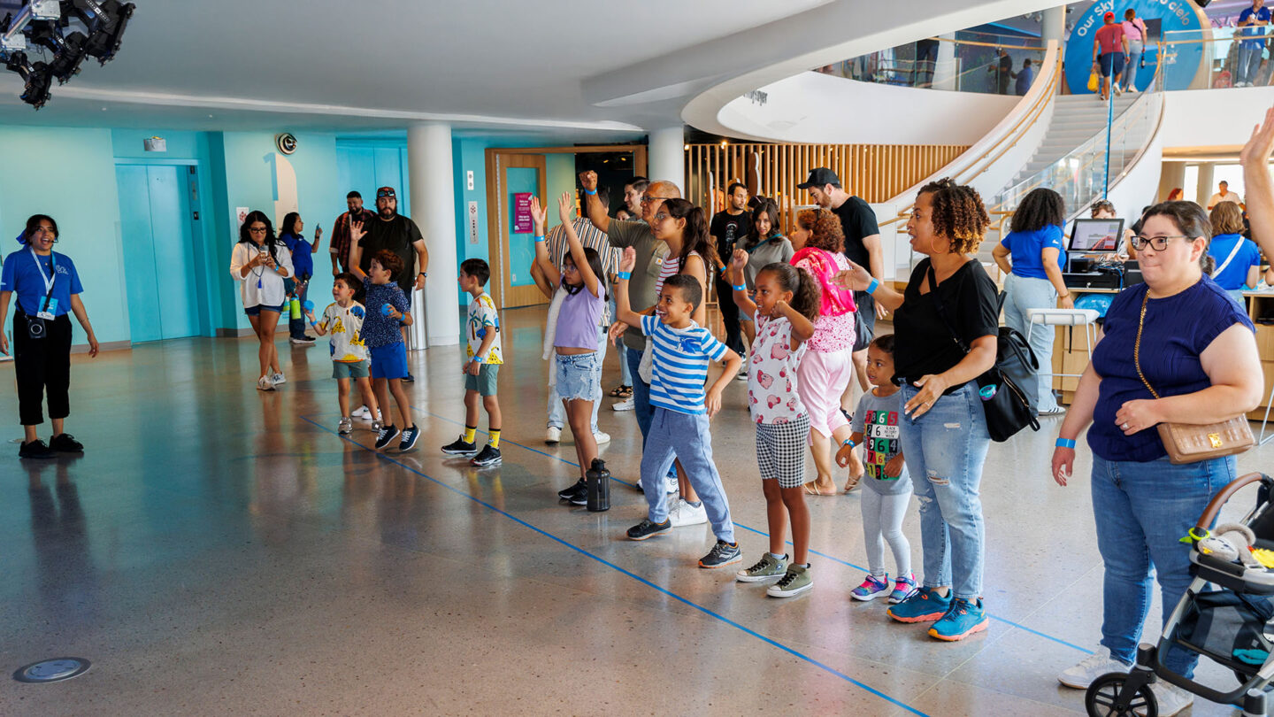 Set against a vibrant blue sky, “Connected Sky/Cielo conectado” invites visitors in both museums to engage in a series of whimsical, day-and-night scenes. Inspired by the universal language of play, the design leverages the ease with which children create games, encouraging intuitive interaction and joyful collaboration. The attract mode features a central balloon that begins to slowly drift down igniting the instinct to “save it from the floor!” Reminiscent of a party game, multiple visitors work together to keep the balloon afloat, hidden surprises are revealed, drawing them deeper into the shared digital world.