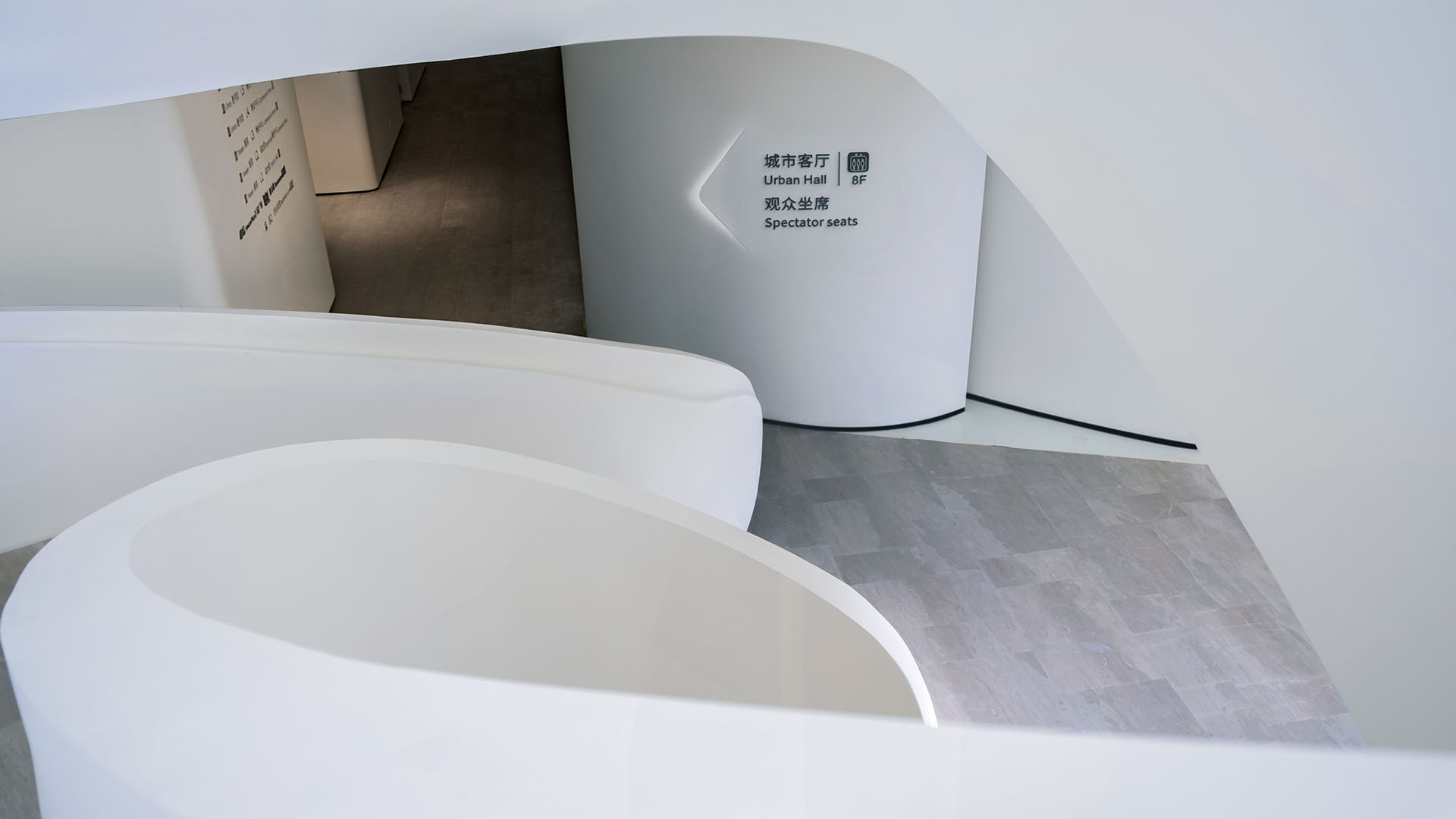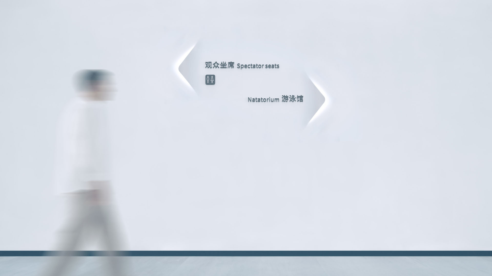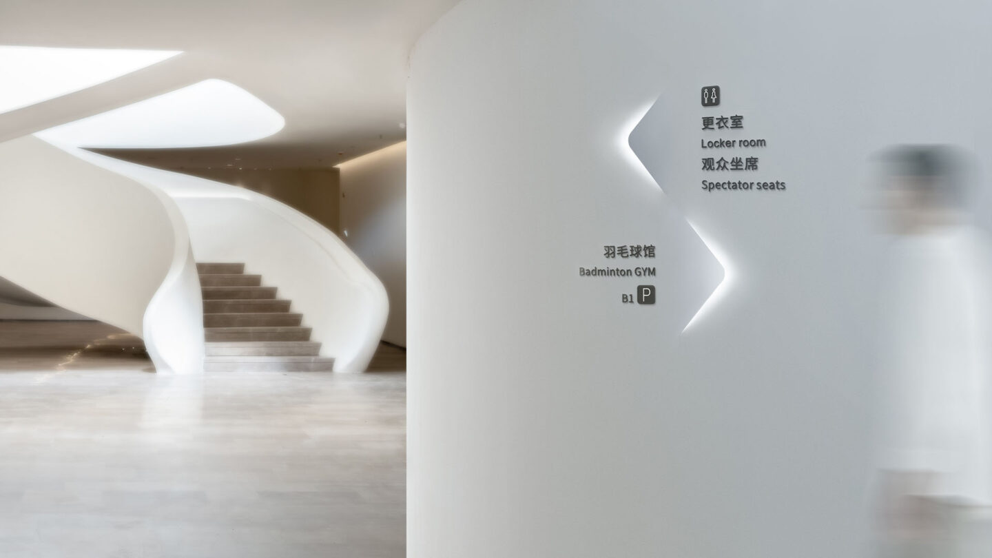 The signage design draws inspiration from the undulating form of the surrounding Tanglang Mountain, continuing the layered imagery of mountains and water. This results in a light and elegant form that echoes the architectural language. The “arrow” in the signage is presented as a cut and folded feature from the wall, maintaining the simplicity and high readability of the textual information while allowing the arrow’s form to coexist harmoniously with the rounded curves in the space, creating an elegant dialogue with the overall environment.