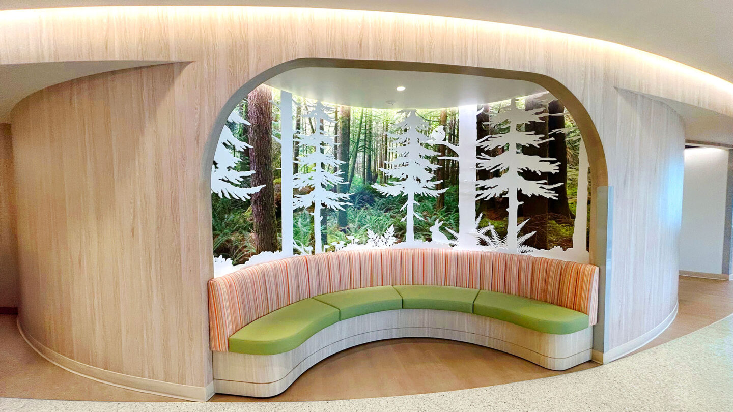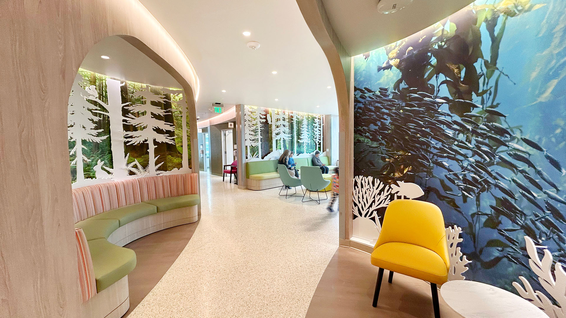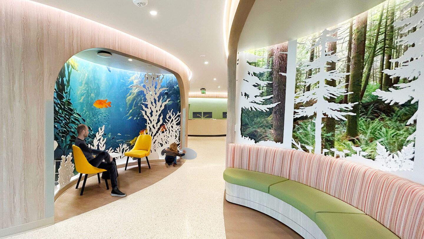 Overall, the clinic is full of welcoming spaces, ready for respite or for play. Young children and young adults alike can use their imaginations to expand their surroundings beyond the walls of the treatment rooms and into the fields, forests, and oceans beyond.