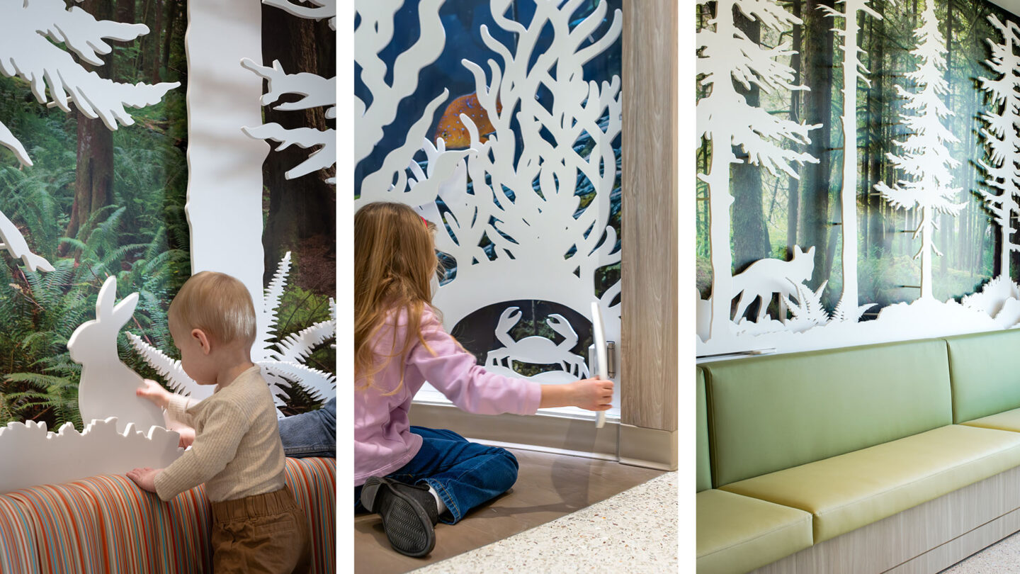 Taking all the valuable feedback with us, the design team developed a system that used photographic representations of a variety of Northern California biomes, paired with a consistent ‘paper cutting’ illustration style inspired by the work of Lotte Reiniger, a pioneer of early silhouette animation. Together, these inspirations create spaces that feel simultaneously realistic and imaginative, engaging children to let their minds wander outside the physical boundaries of the clinic walls.