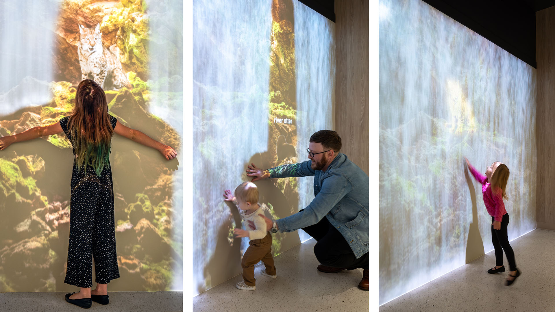 Blending all of the biomes, the digital waterfall designed by Belle & Wissell responds to touch, parting the water to reveal realistic representations of various animal friends found throughout the project.