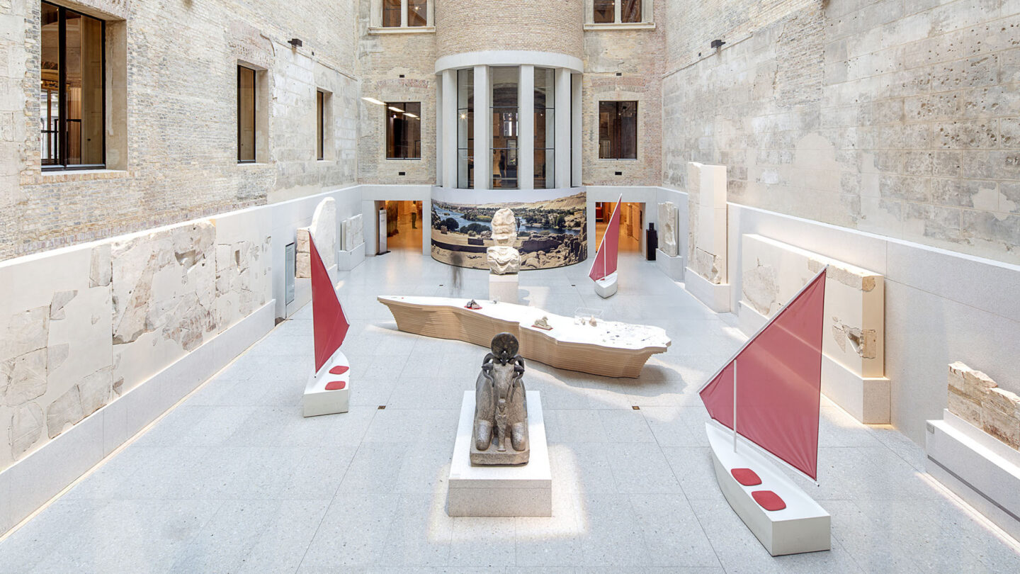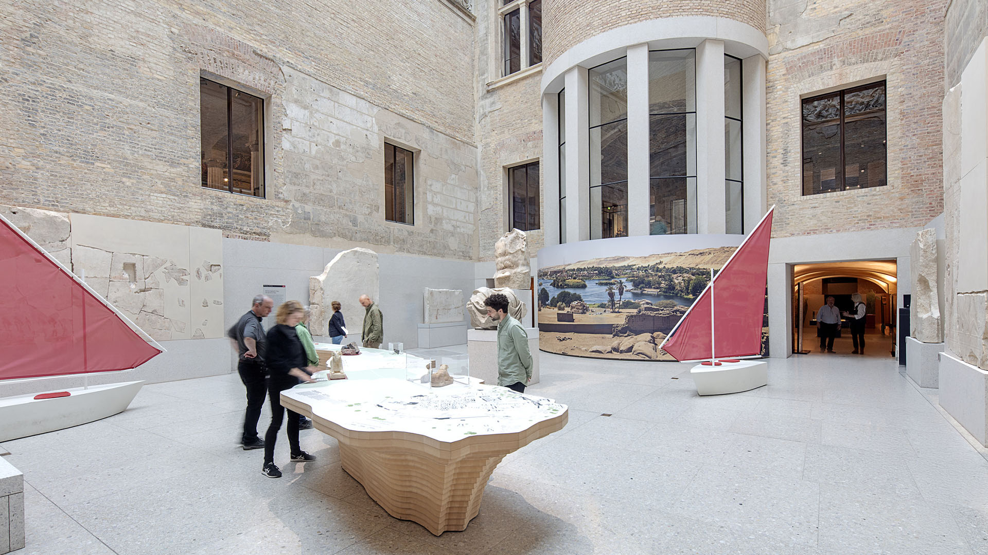 A subterranean passage connects the James-Simon-Galerie with the Neues Museum, where the exhibition continues in the “Greek Courtyard”. In this daylight-filled hall, the topic is ‘space,’ and the view changes to a bird’s eye view of the island of Elephantine. A large model of the island, which visitors can walk around and explore, provides an overview of its dimensions. As in James-Simon-Galerie, there is a series of abstract feluccas, from which visitors can view the island and listen to the sound installation. A panoramic image of Elephantine forms the backdrop to the room.