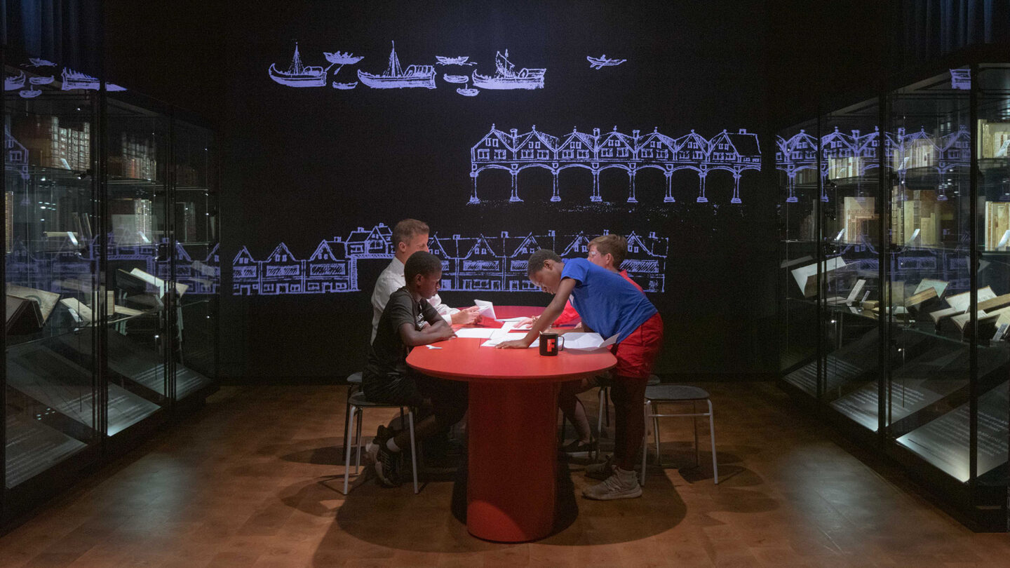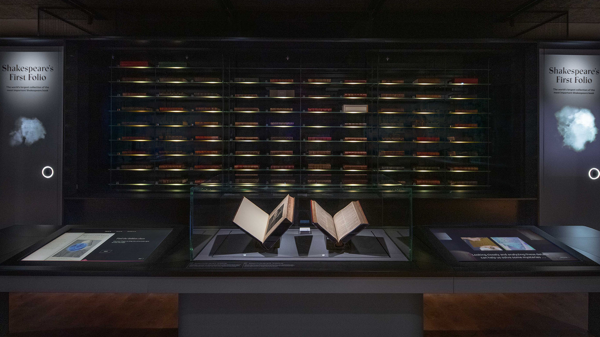 At the gallery’s center, a high conservation case displays 83 first folios. Two media-driven experiences flank the case, offering interactive content about ownership, marks, and syncing lighting with storytelling.