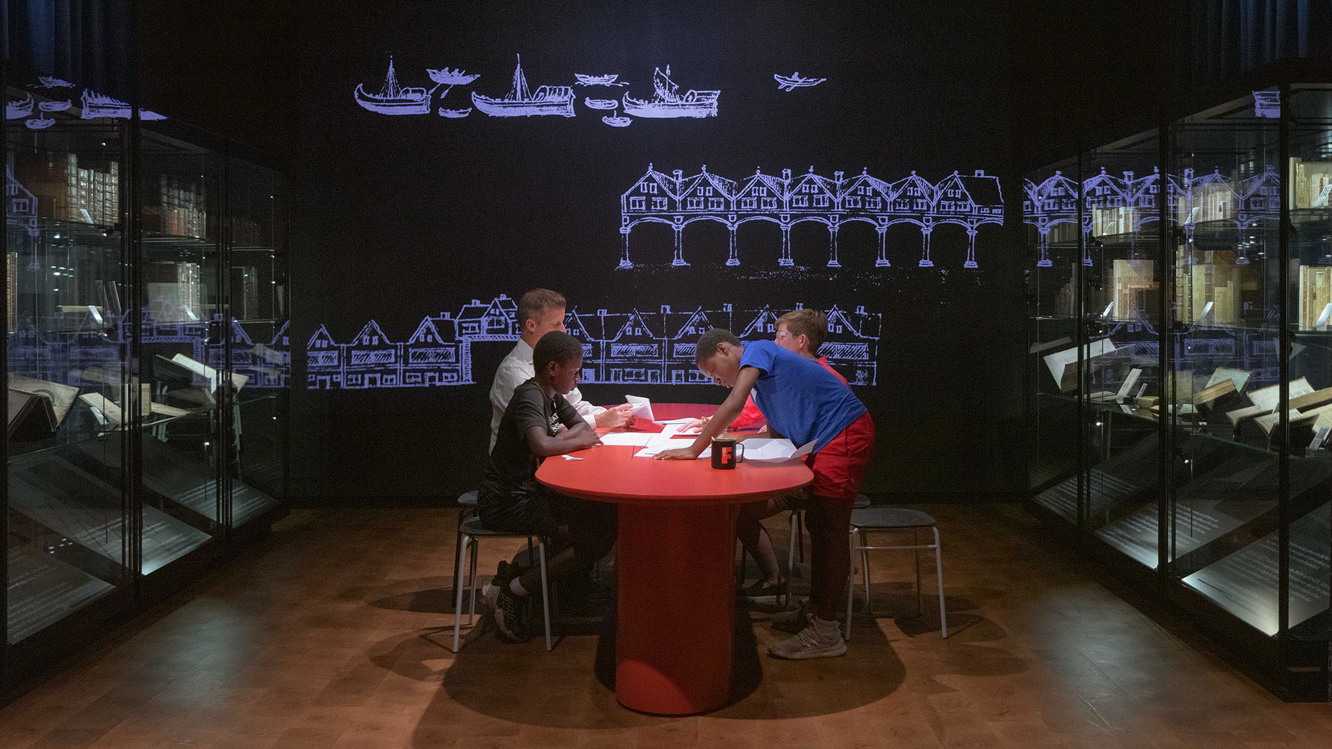 The gallery’s center features dense displays, video projections, and hands-on experiments. Visitors engage in docent-led or self-guided activities around a table, fostering community learning with synchronized archival materials and projections.