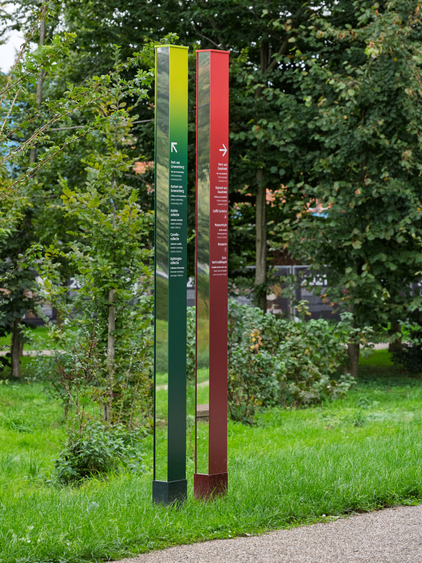 Gaasbeek and Groenenberg parks sit side by side, each with its own character. Gaasbeek is known for its historic buildings, while Groenenberg showcases diverse plant life. Our challenge was to create a wayfinding system that would unite these different spaces while respecting what makes each special. “Forest Reflections” Capturing the changing seasons, showing autumn colors in fall and fresh greens in spring. Creating a touch of magic in the forest setting. Blending in and standing out, the slender totems with mirrored sides that reflect the surrounding nature.