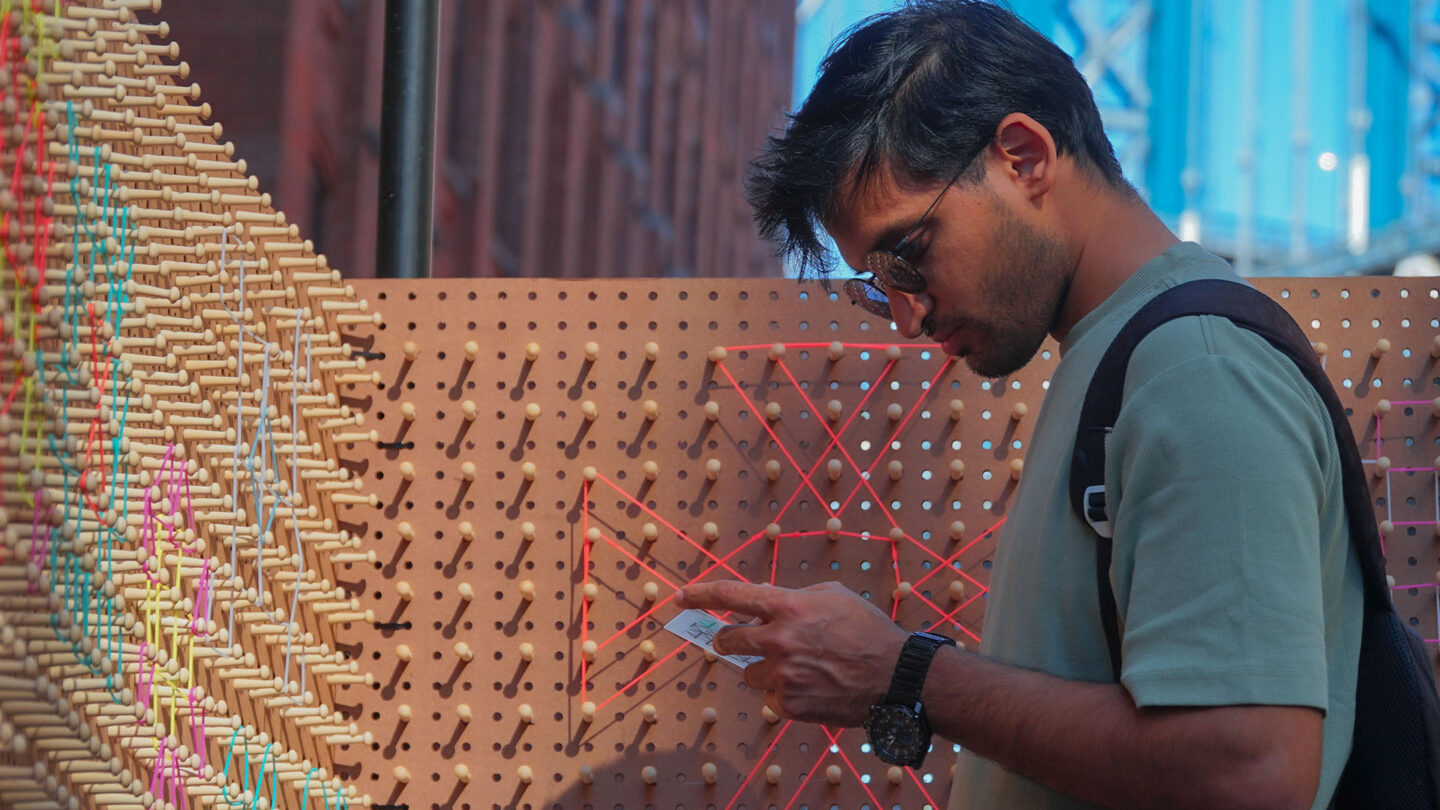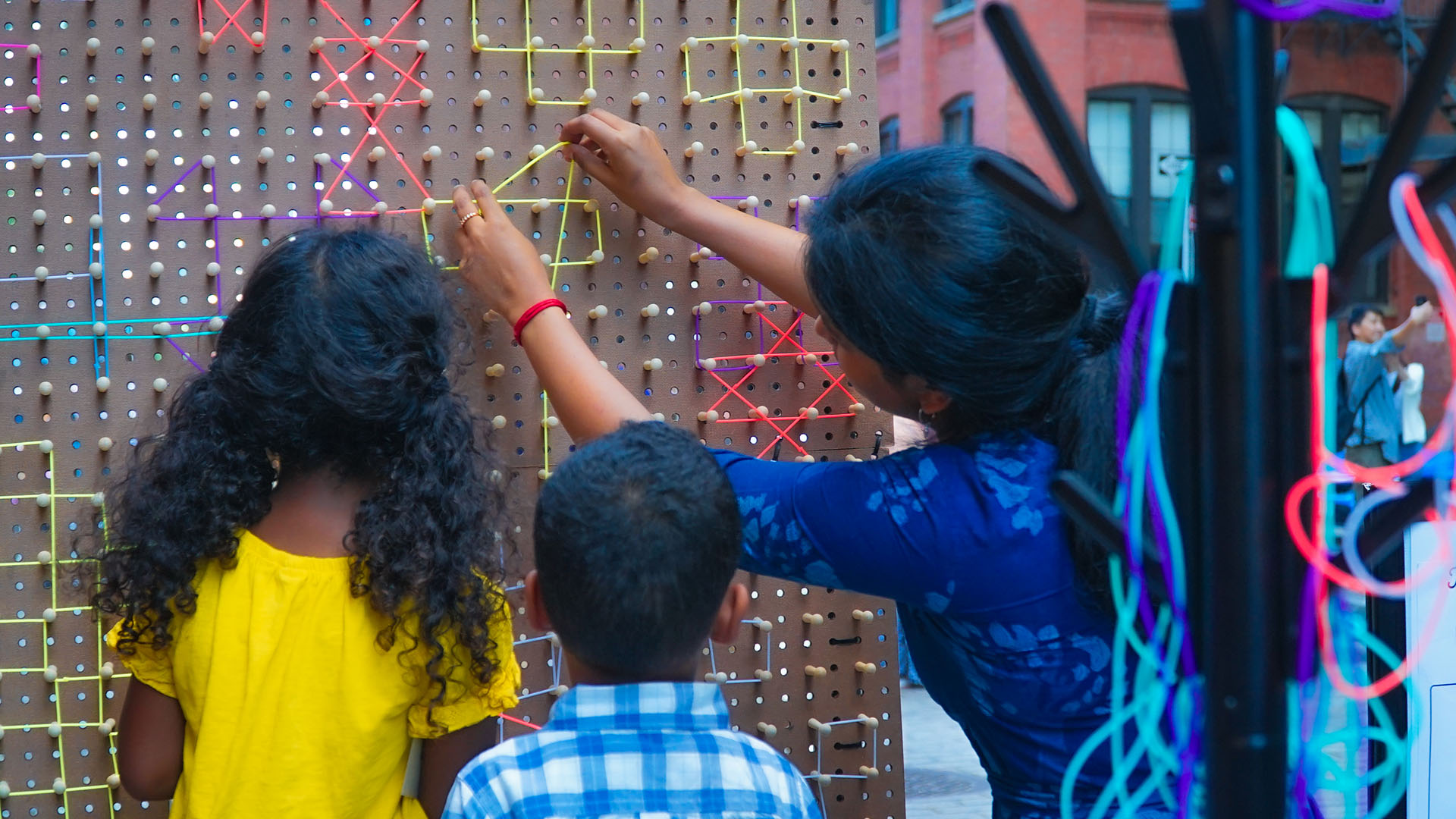 Built as a 6′ x 6′ x 6′ enclosure using tempered hardboard, this installation used a grid of pegs inspired by the dots found in traditional kolam art. Stretchy colored loops could be woven around the pegs to form shapes, keeping the visual connection to the art form while encouraging a more hands-on, intuitive kind of interaction.