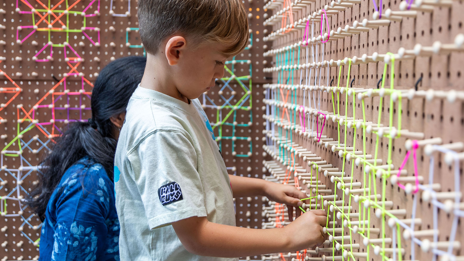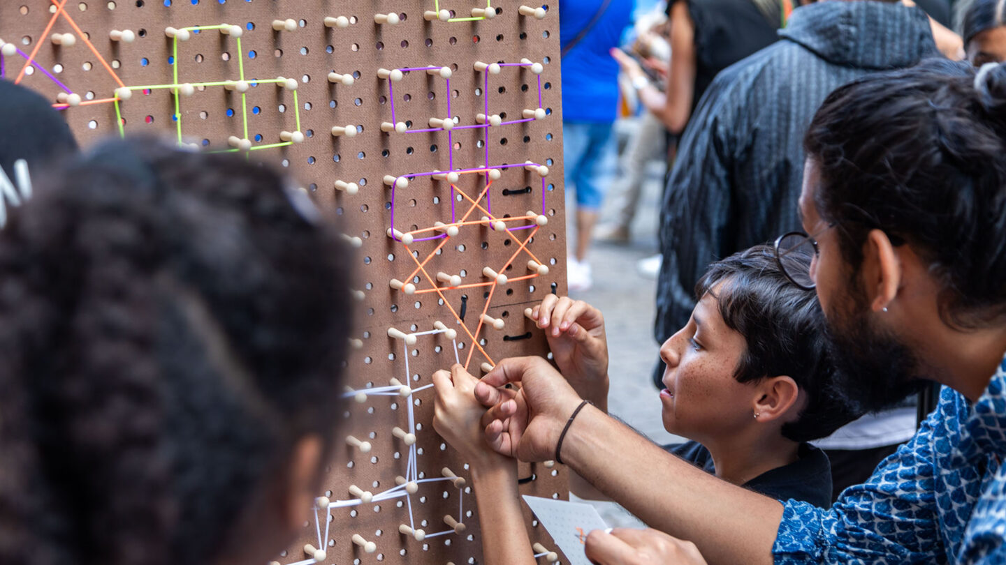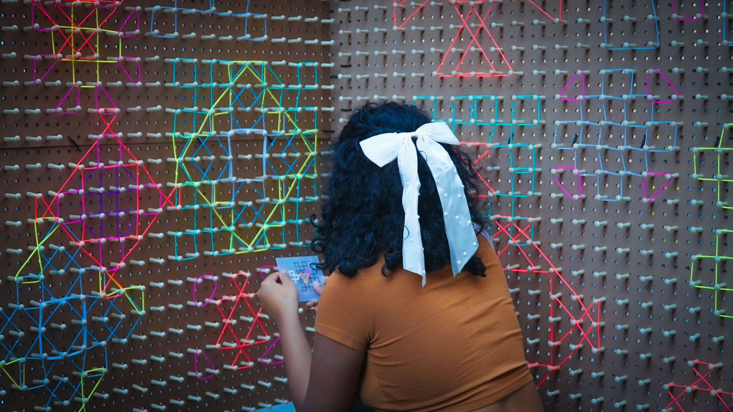 Participants picked a cue card from a pile—each showing a pattern at a different level of complexity—and tried recreating it using loops of the right size and color. The act of recreating opened up space for collaboration, interpretation, and imagination, and was easy to adapt to different levels of ability and interest.