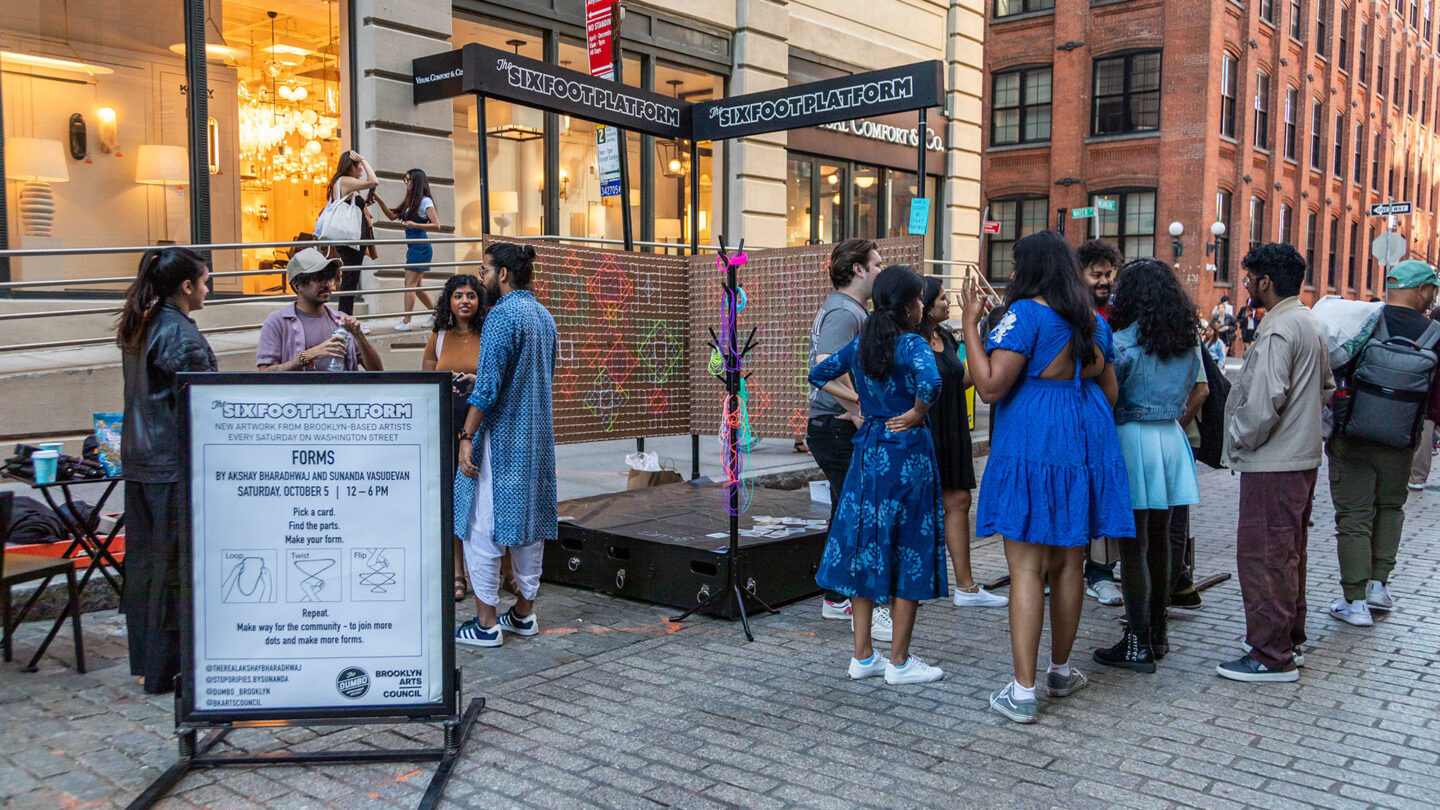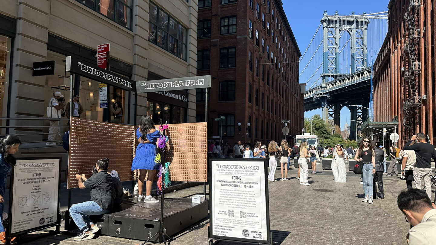 The challenge was the creation of a participatory public art experience housed within a 6×6×6 platform and placed on a busy Brooklyn street with a view of the Brooklyn Bridge, designed to invite passersby and tourists to contribute to a growing mural.