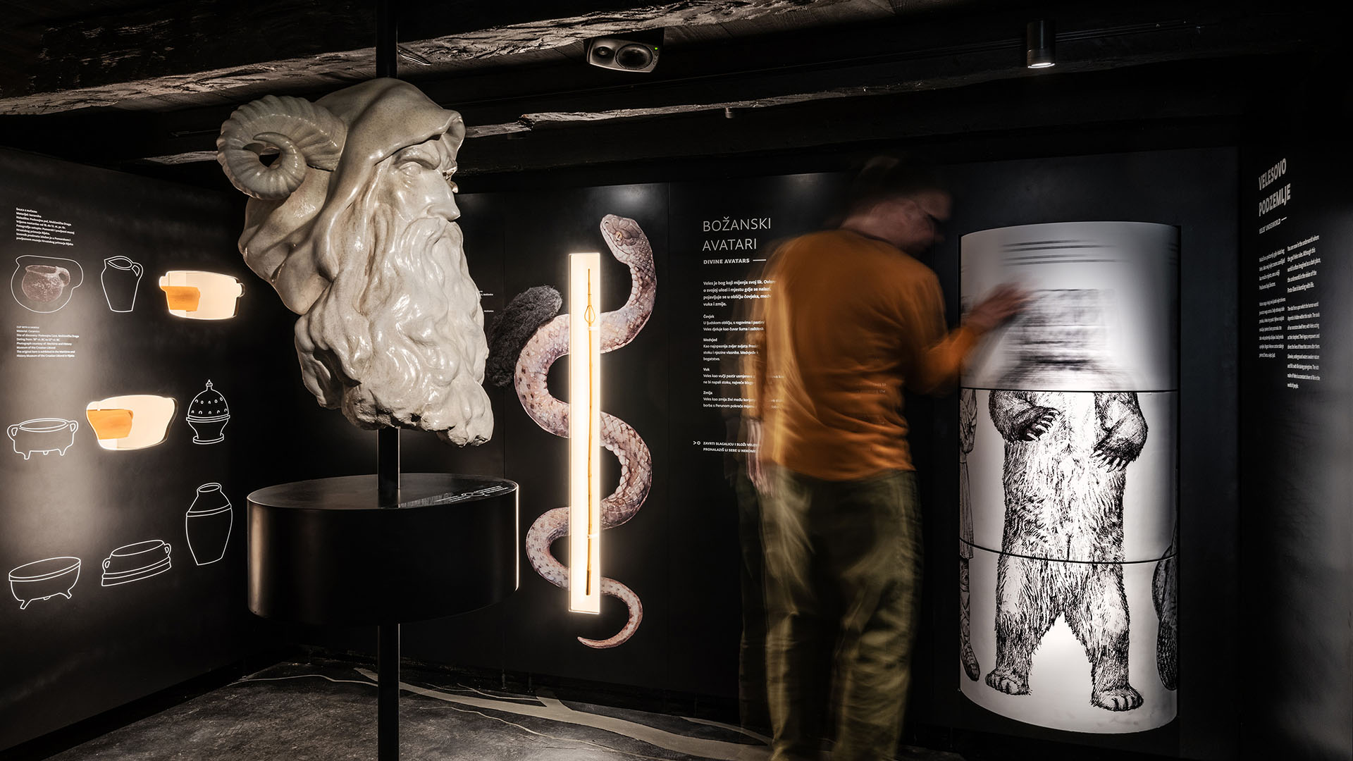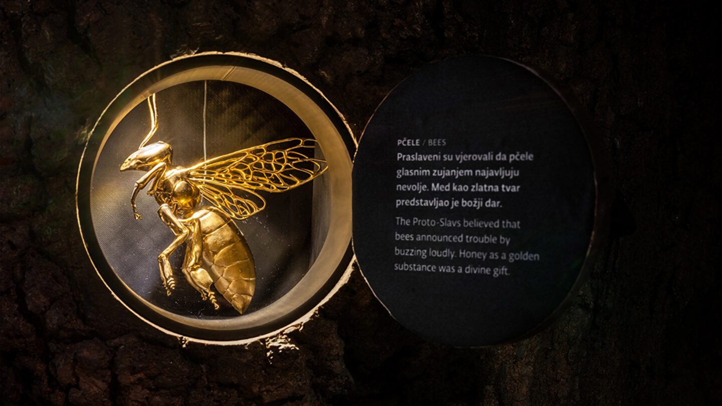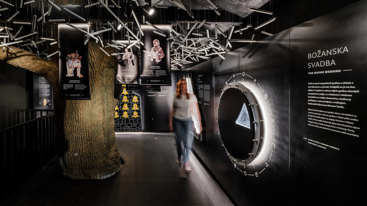 The main motif inside the house is a sculpture of an oak tree, symbolizing the ancient Slavic cosmos. For inspiration, we studied over a hundred oak trees in the vicinity of Zagreb and Kvarner Gulf. Very old oak tree called “Dedek,” which is about 600 years old served as the main inspiration for the sculpture. The highlight of the exhibition is also spatial interactive installation of a treetop, inspired by the exhibition’s visual identity, which reveals the connection between the ancient Slavic deities and our world.
