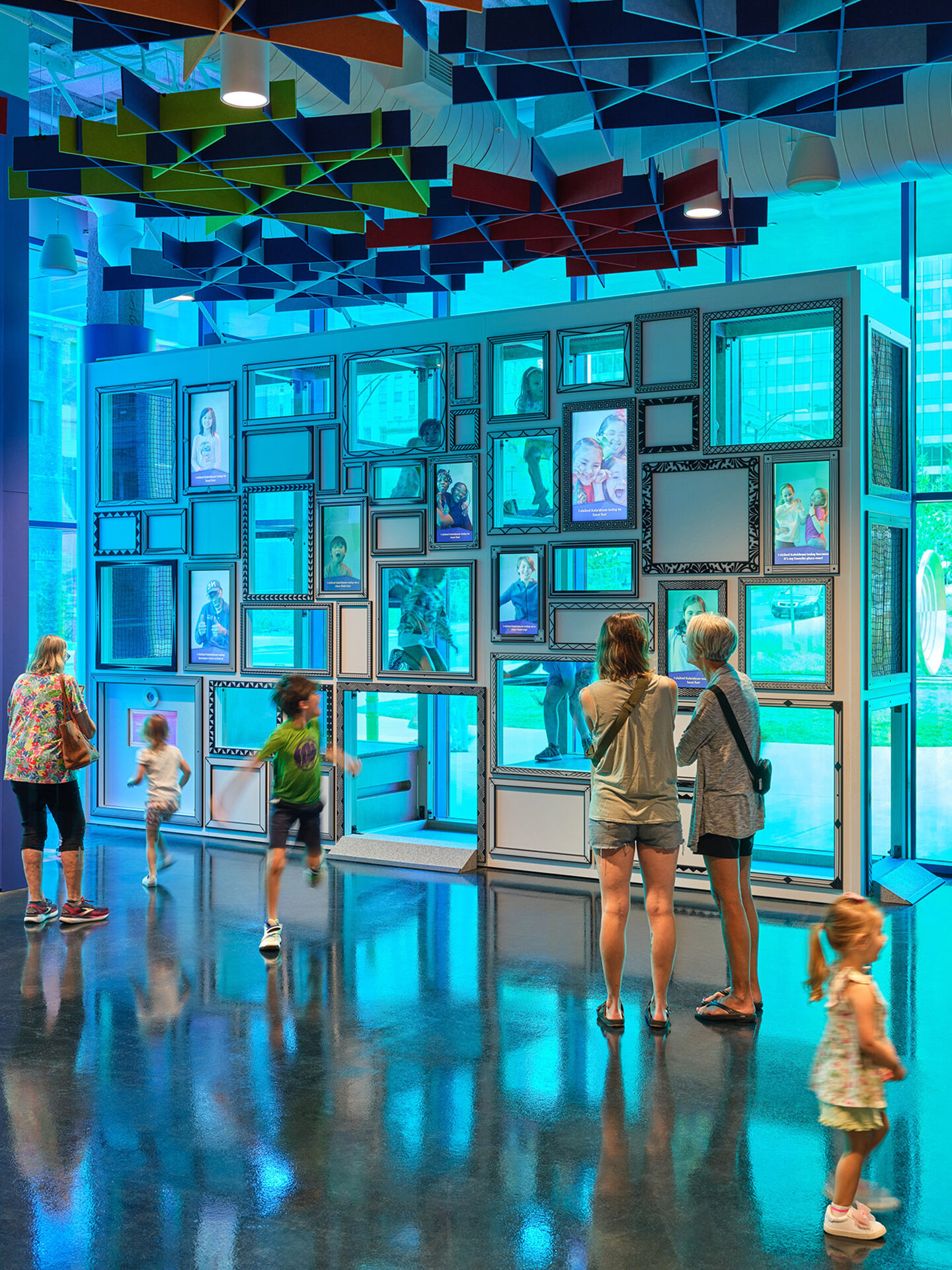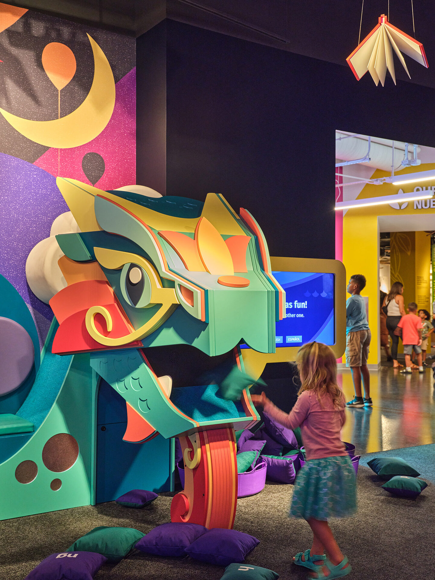 Exhibit highlights include the exhilarating Fog Tunnel, where guests experiment with light and air in a colorful mist-filled experience, and the innovative Photo Fort Climber, which combines physical play with dynamic self-portrait displays that allow guests of all backgrounds to literally “see themselves” in the museum. The “Storytelling” gallery features an artfully imagined letter-munching dragon that engages young visitors in phonetics and the science of reading.