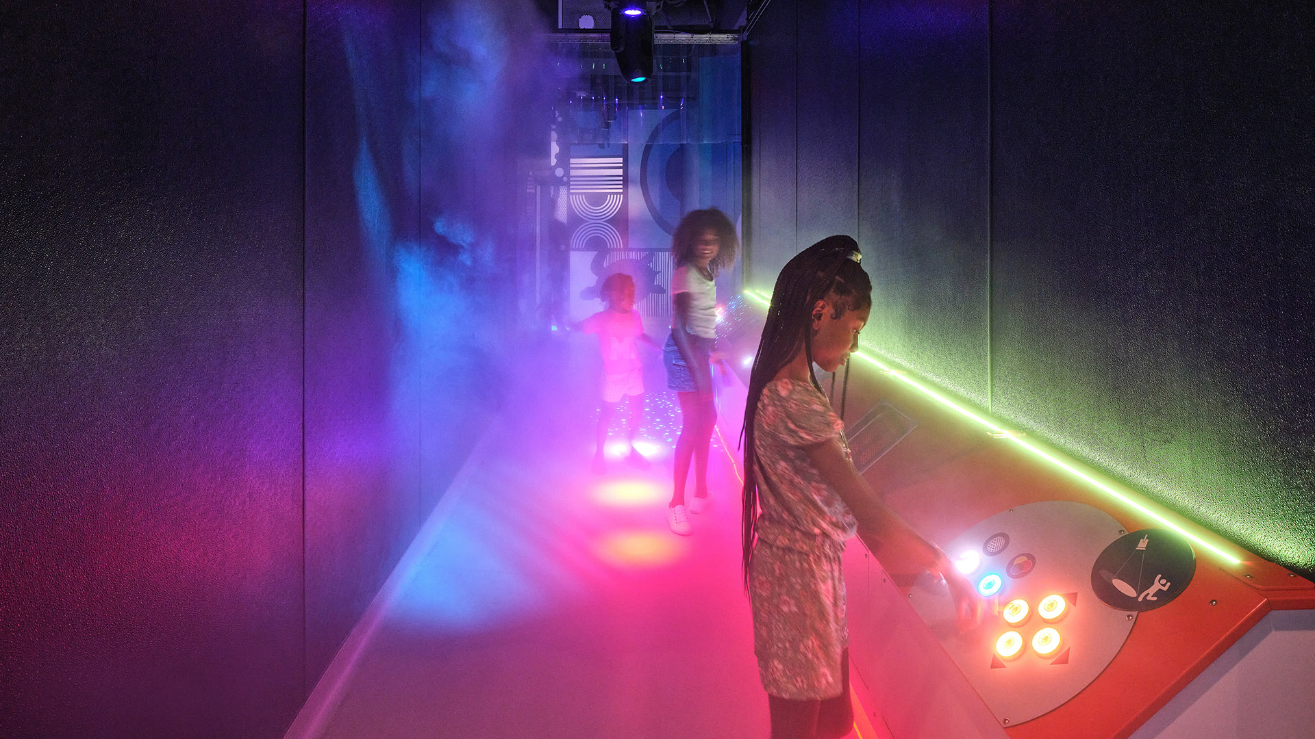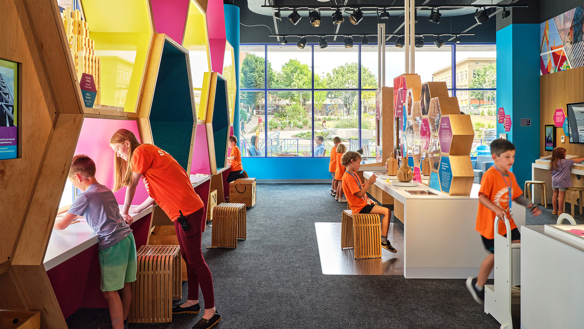 Kaleideum, opened in early 2024, represents the dynamic merger of SciWorks and the Children’s Museum of Winston-Salem. The facility and its exhibits embody the institution’s objective, and primary challenge, of creating an experience that is a seamless fusion of the two previous museums – a seamless fusion of art and science – akin to a kaleidoscope. This integration became the ethos in both the museum’s visual language and its interactive experiences.