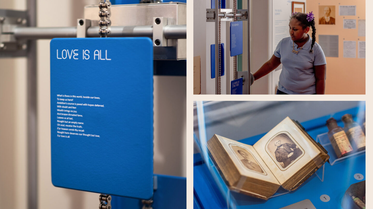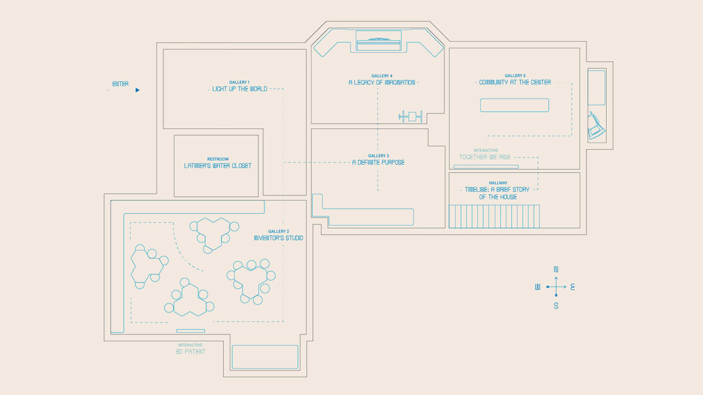 The team studied primary source material such as Latimer’s blueprint drawings, his extensive handwritten narratives in his journals, and his artwork to develop a distinctive visual identity and a custom typeface called Filament. We also designed an architectural framework that feels futuristic while evoking the material aesthetic of his time — a time when the mechanisms of the industrial era were giving way to the beginnings of the electric world. Both the graphic design and the architecture had to be carefully calibrated to complement a compact space, providing opportunities for close observation and narrative while creating space for large student groups to gather and for accessible flow through the house.