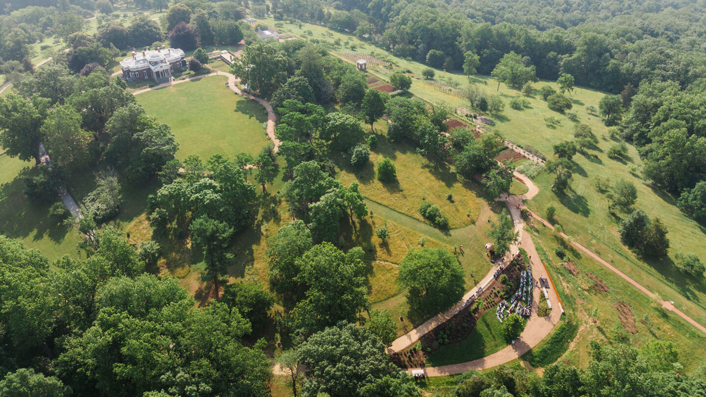 Set in the Blue Ridge Mountains, the Contemplative Site (bottom right) sits in quiet dialogue with Jefferson’s plantation home, Monticello (upper left).
