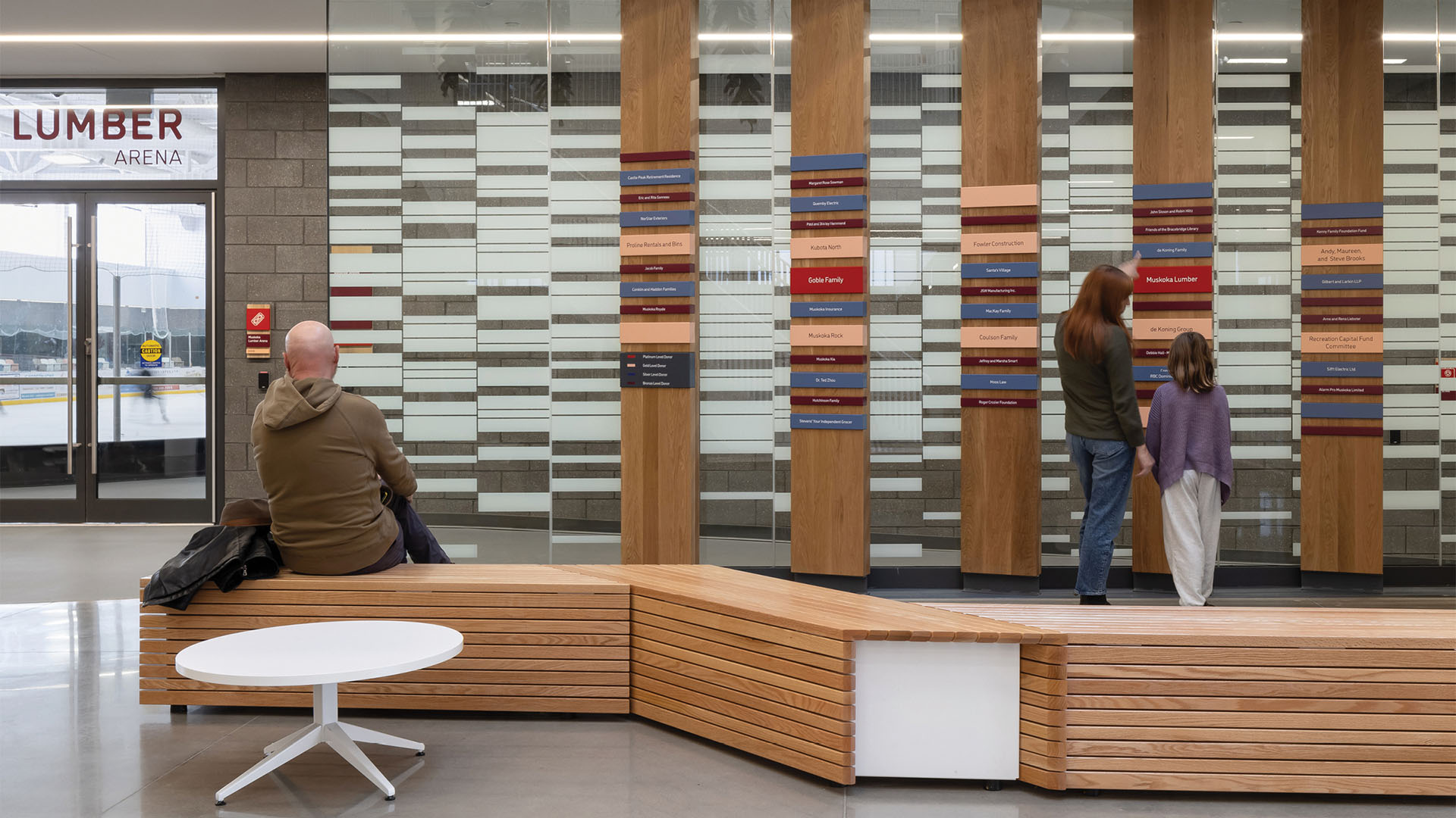 The primary sponsor, Muskoka Lumber, worked with the design team to create ship-lap interior siding made from donated wood, referencing the region’s architecture. Off-cuts were used for signage and wayfinding.