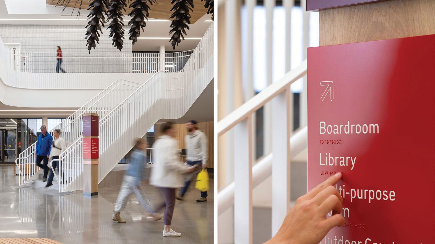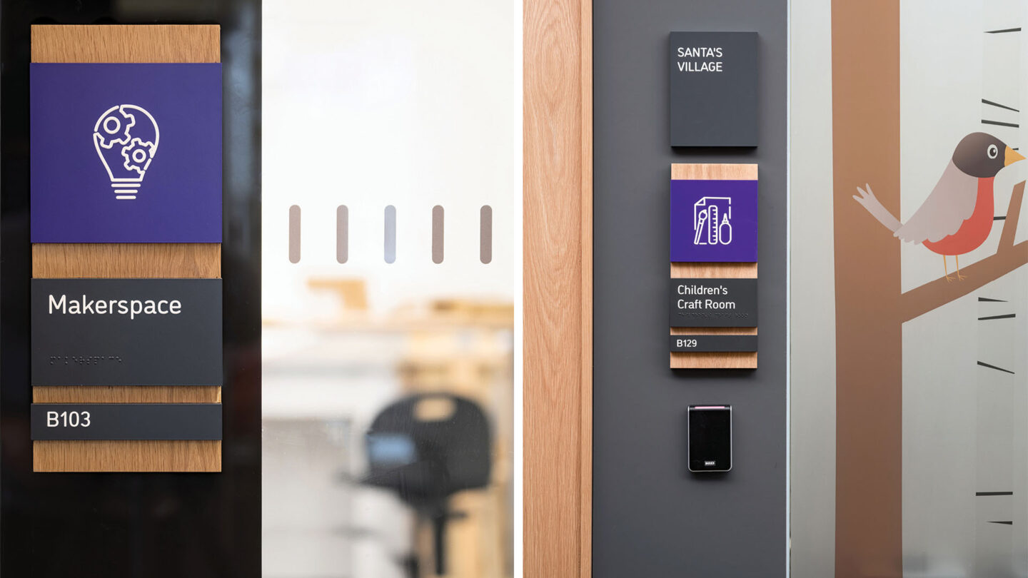 The wayfinding design has excellent connections to the locality for this community centre. The color scheme is beautiful, connecting to the seasonal color shifts of the lake and the forests. The community’s deep connection to the lumber industry also shows coherent material choice.