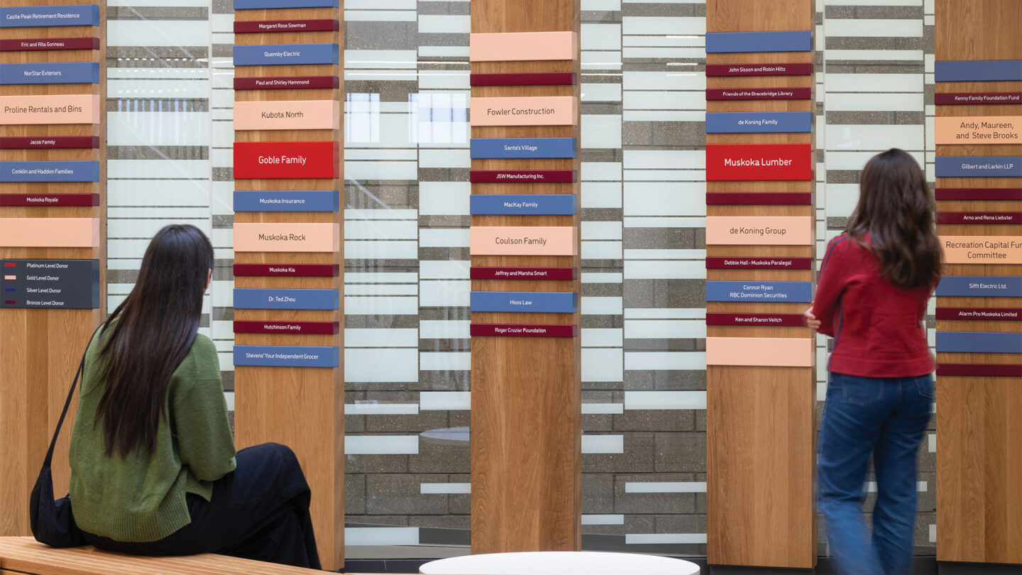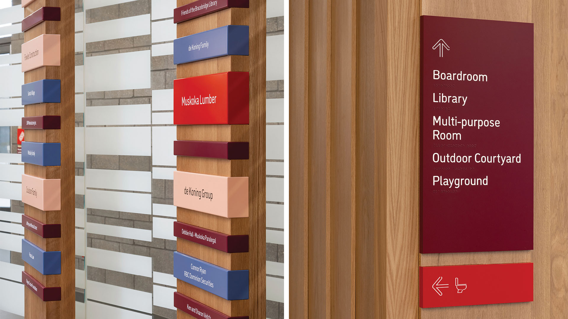 Donor wall in lobby; custom aluminum channels inset into routered solid oak timber; and directional signage – both referencing local signage tradition and colors of the Muskoka region.