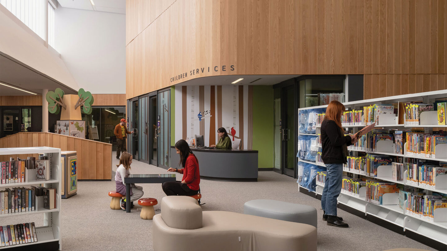 Library with shiplap interiors; library signage with bespoke playful pictograms inset into oak timber backer.