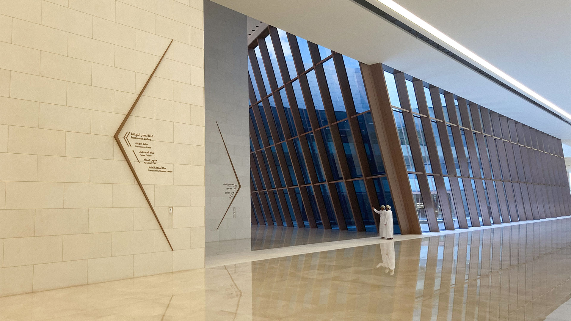 The Oman Across Ages Museum sits within an extraordinary setting. Emblematic of the Hajjar Mountains of Oman, the architectural design by Cox Architects of Australia took inspiration from the jagged, angular forms of Oman’s primary mountain range, creating a sculptured composition that rises powerfully from the land. Triangulated earthen, three-dimensional plates fold up to create a striking crescendo against the horizon.