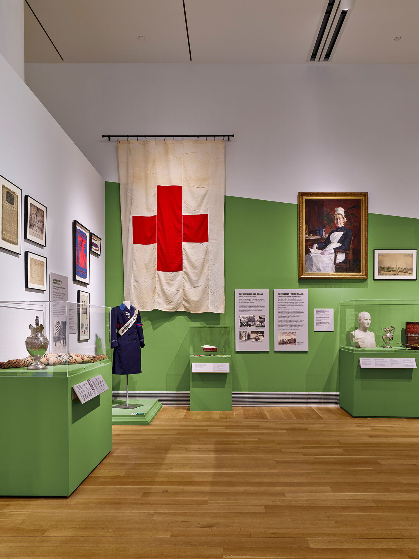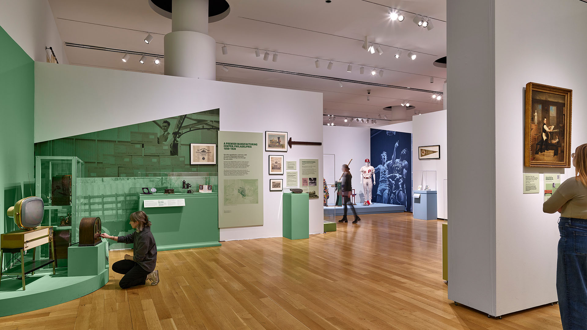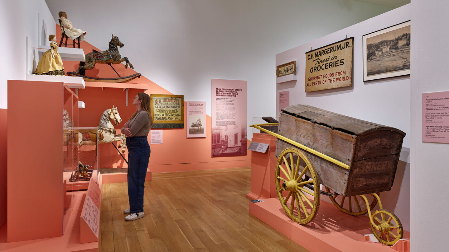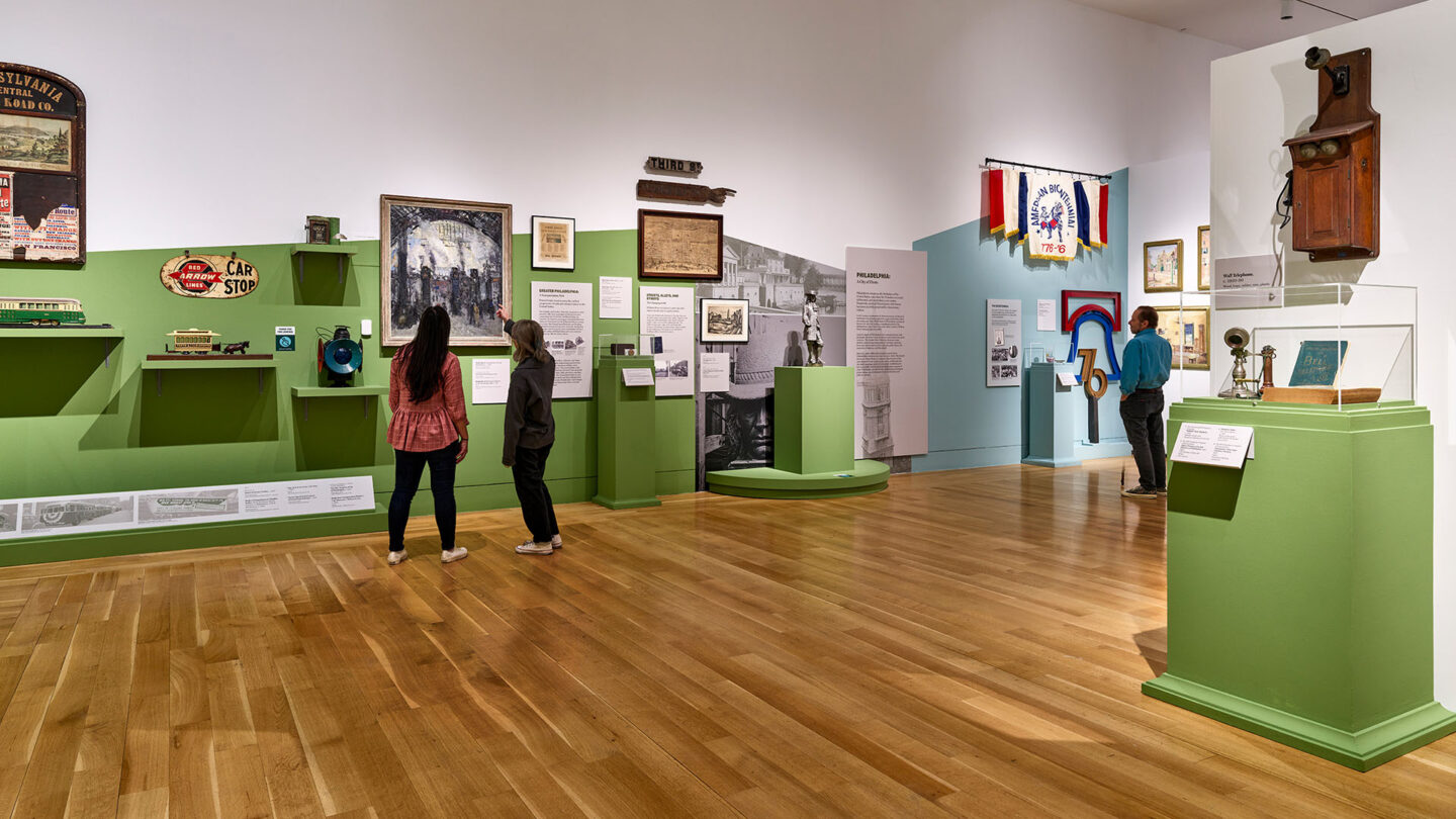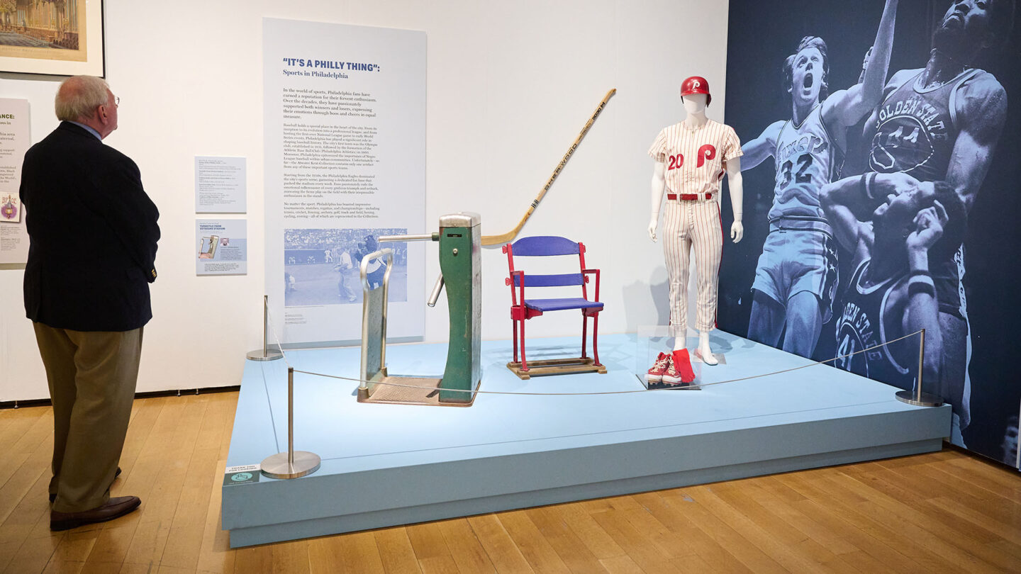 Divided into a series of thematic sections with a vibrant, contemporary color palette, “Philadelphia Revealed” showcased objects from national anniversary celebrations, civil rights movements, and Philly’s history as a city of manufacturing and medicine, as well as toys, clothes, and sports memorabilia. Artifacts ranged in age, type, and provenance, from1700s objects dredged from the Delaware River to 1800s abolitionist artifacts, to 1900s scrapbooks rescued from the trash. Many were donated by Philadelphians throughout the decades of the Collection’s history. Each section includes a “vignette” — a platform display with multiple objects and large super-graphic backdrops.