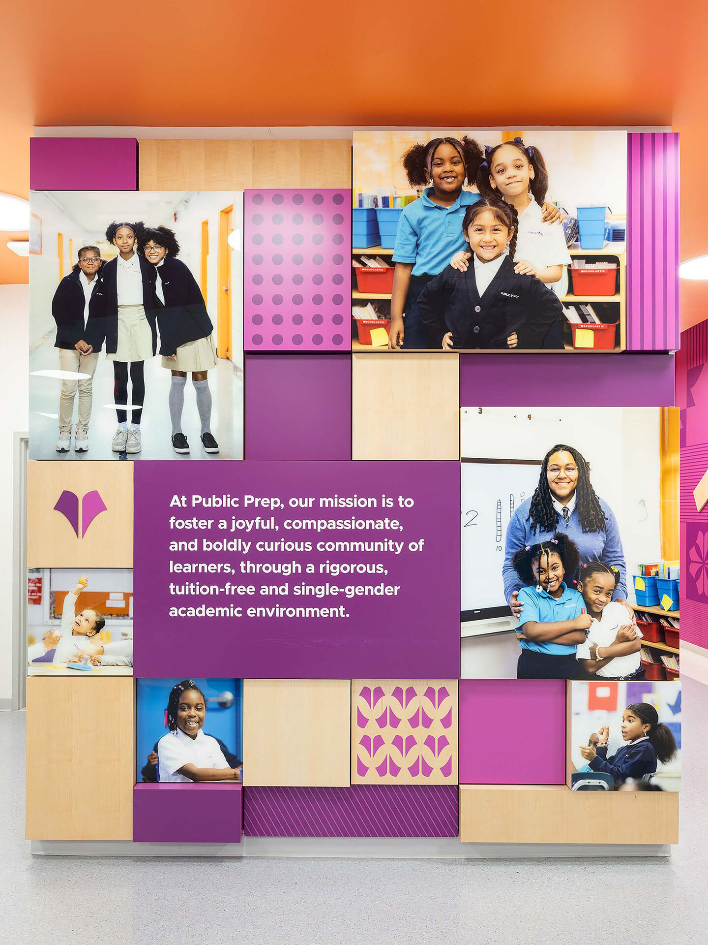 The Public Prep “Mission Wall”, constructed of modulated blocks of text and image, greets visitors in the lobby.