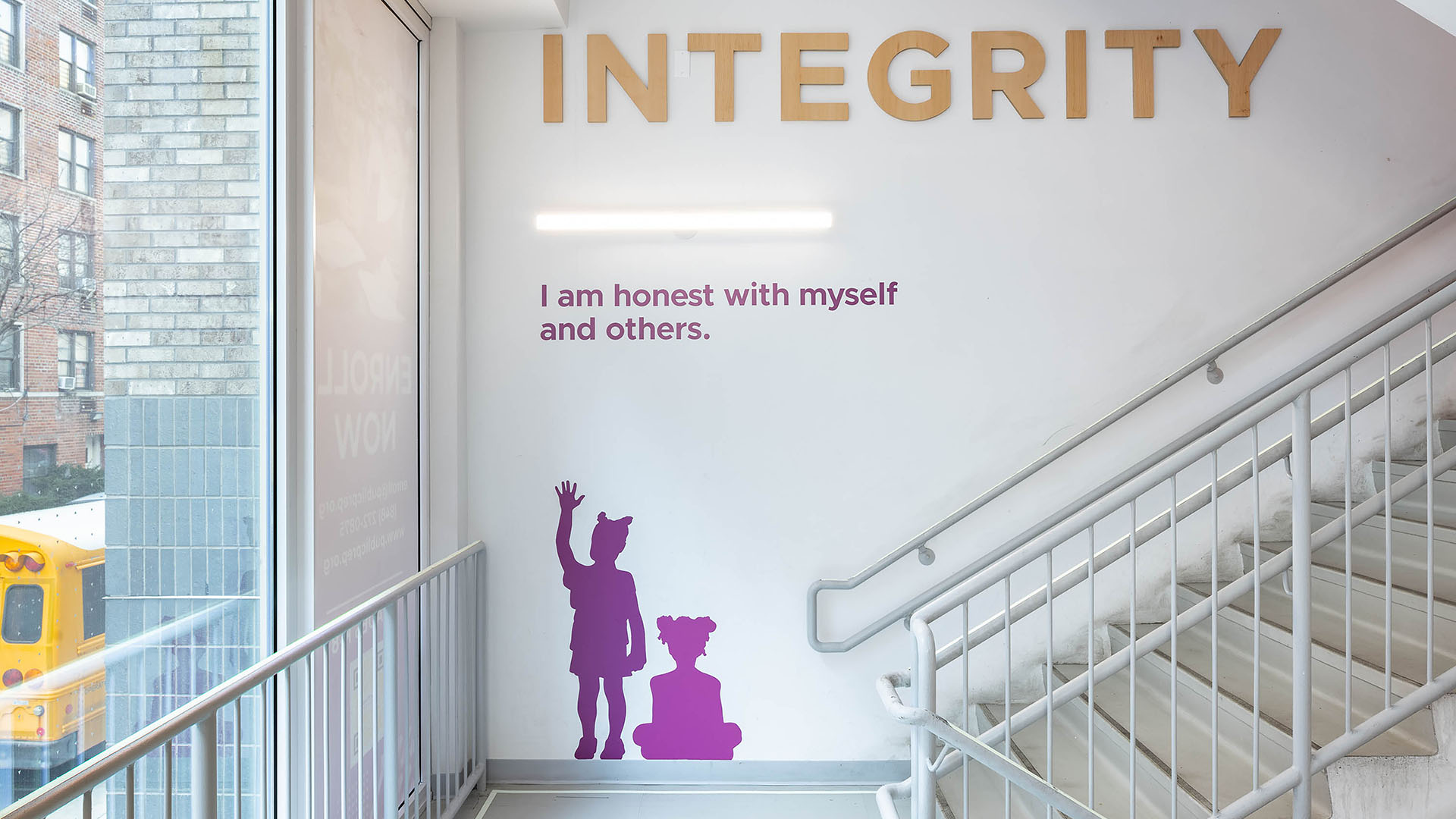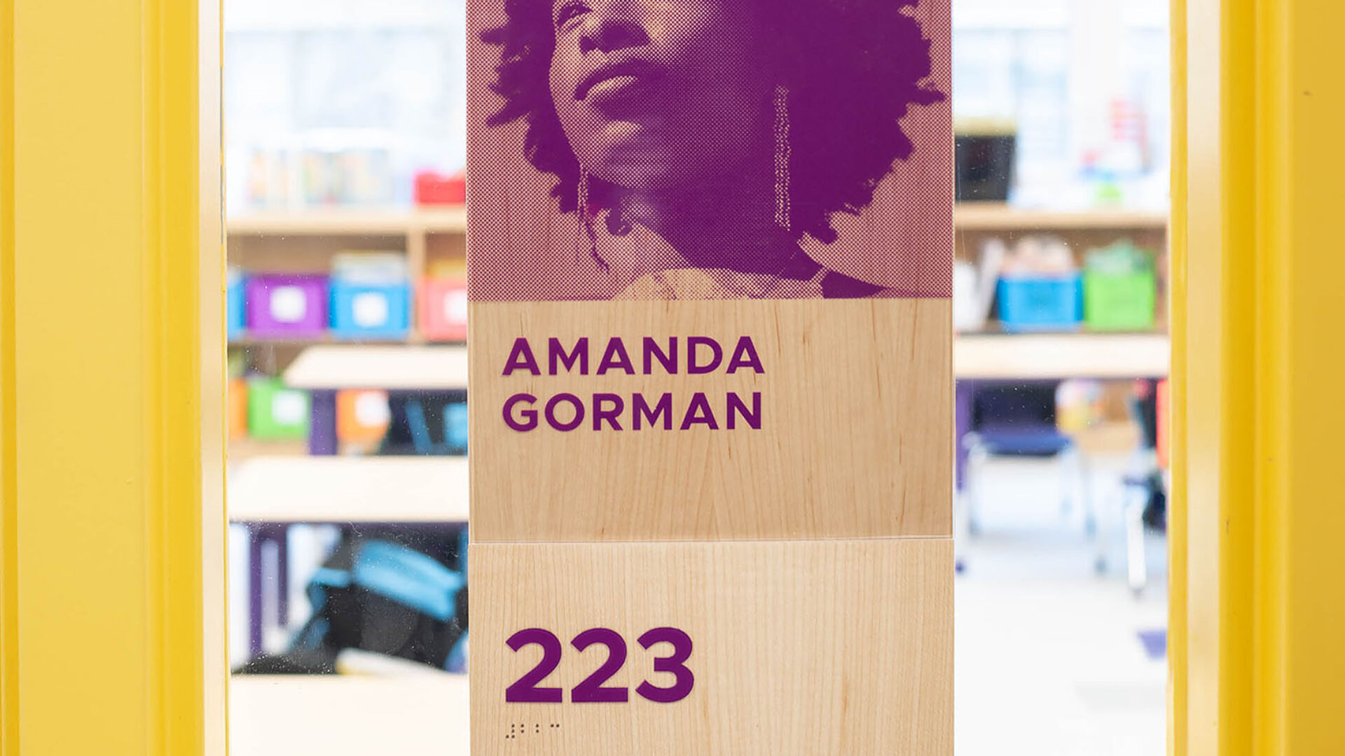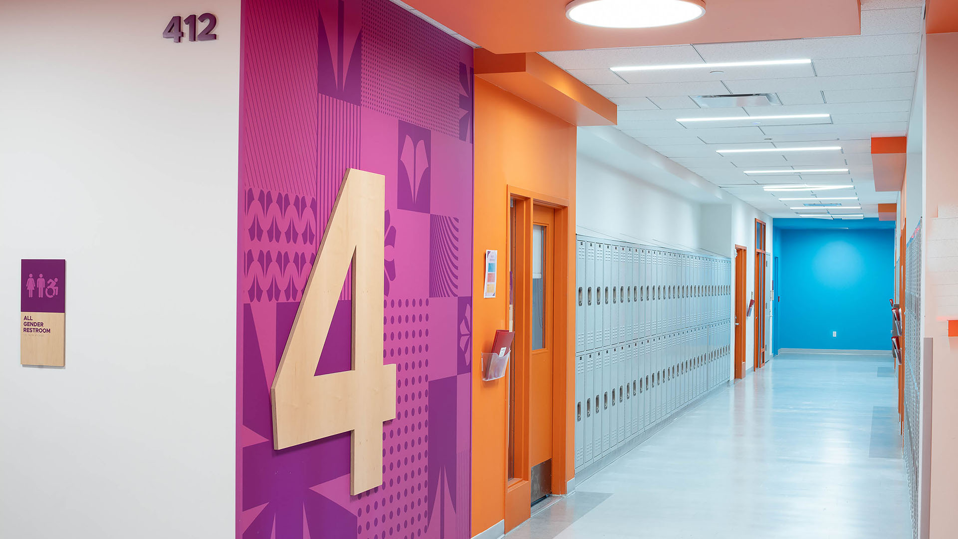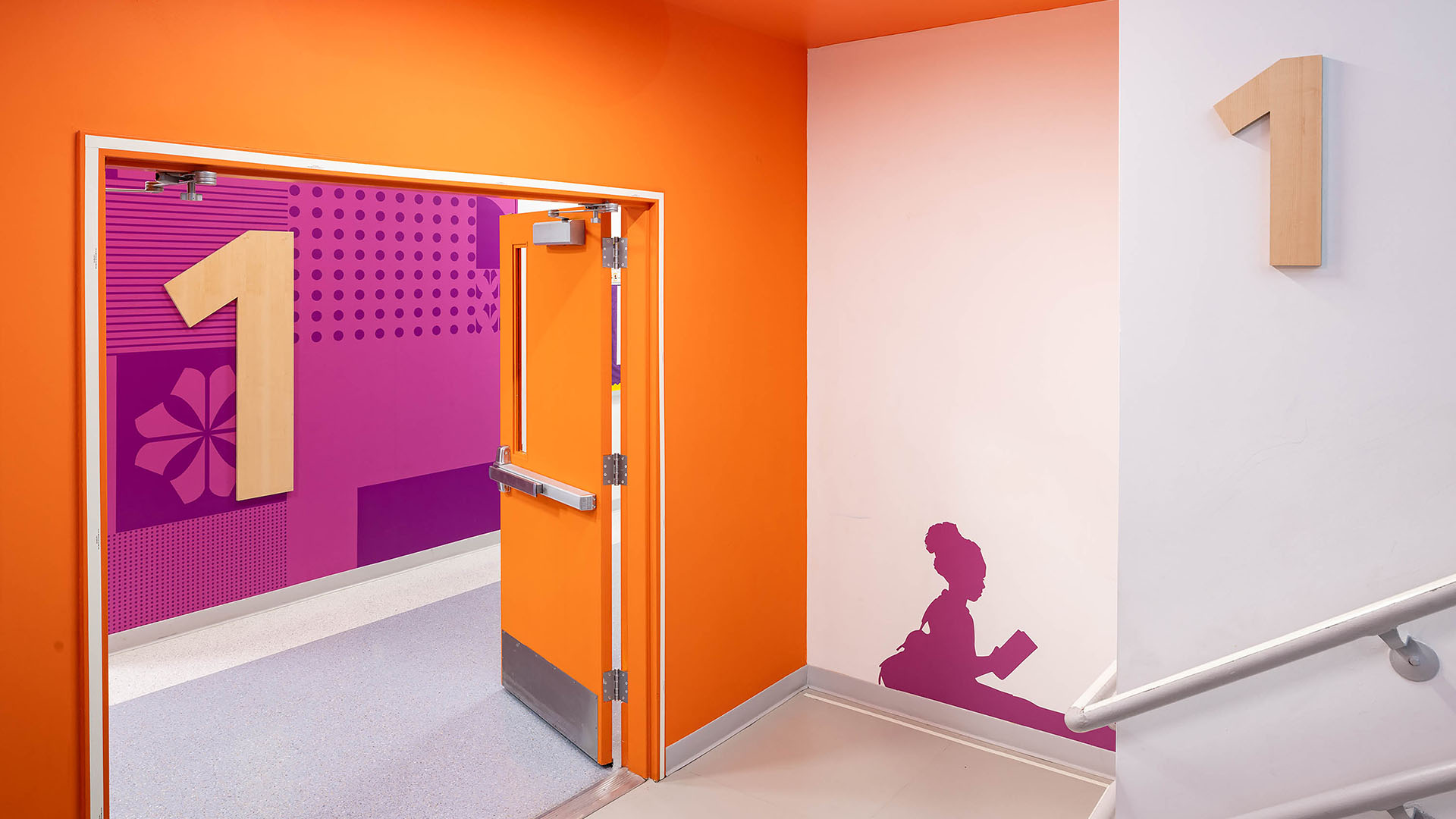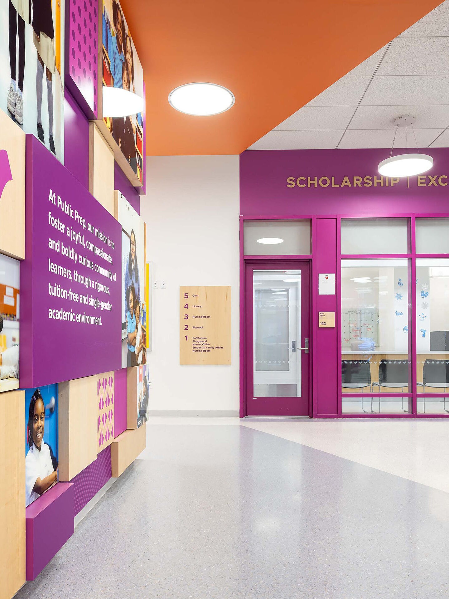 Via Collective’s signage and environmental graphics expressed the palette of color, typography, and pattern established in the recently-implemented brand guidelines across a series of navigable and memorable interventions. Mosaic patterns of the Public Prep brand fill immersive wall graphics that punctuate key circulation moments. These patterns and identification signage extend the voice and color of the Public Prep brand throughout the space, yet is uniquely expressed through the volumetric and colorful environment designed by Michael Graves Architect. The signage finish palette merges the Girls Prep II brand with the warm maple wood of the interior furnishings to create a seamlessly-integrated system that is both surprising and clear.