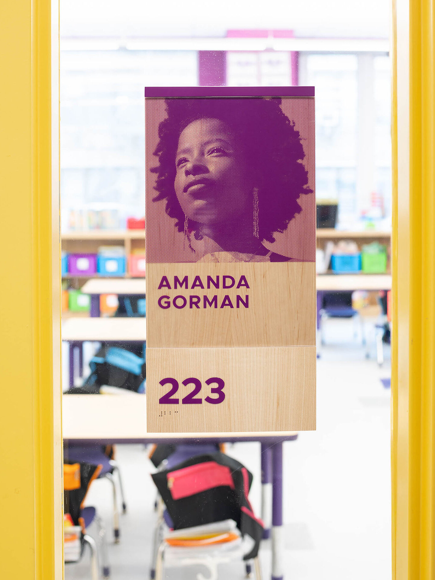 Room identification signage includes portraits of inspiring female figures associated with each classroom.