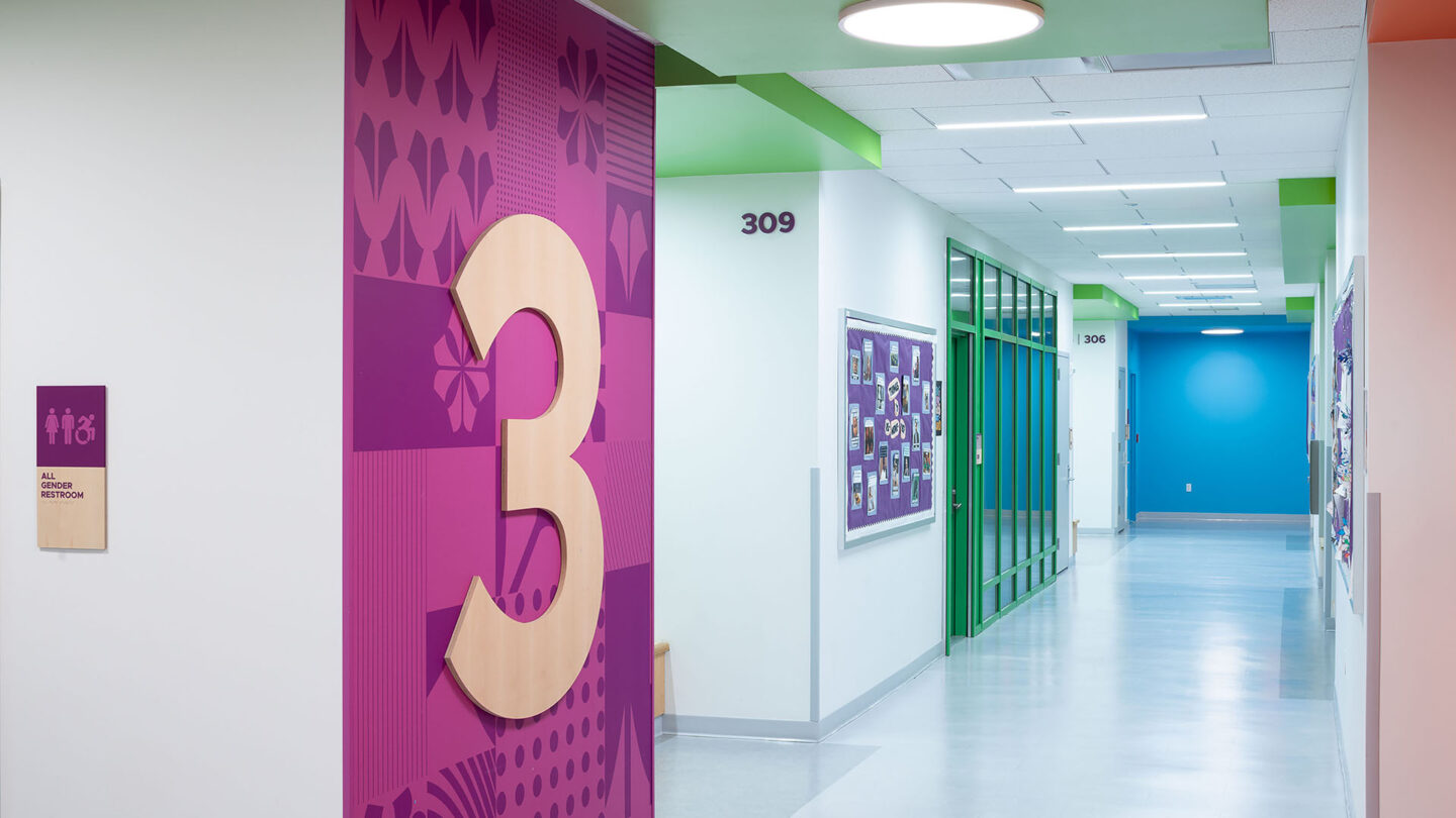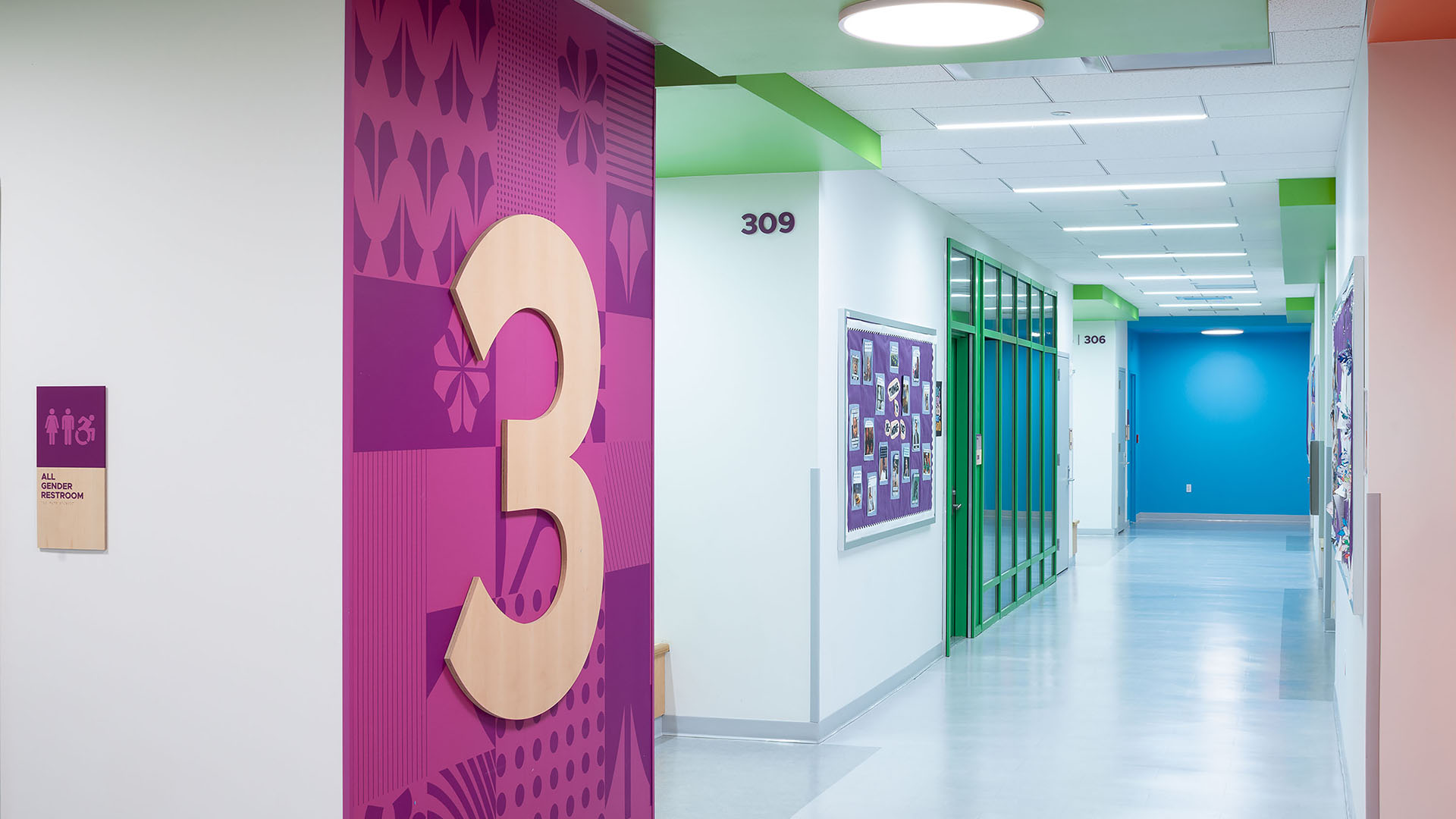 Environmental graphics form a mosaic pattern through wall murals and sign modules.