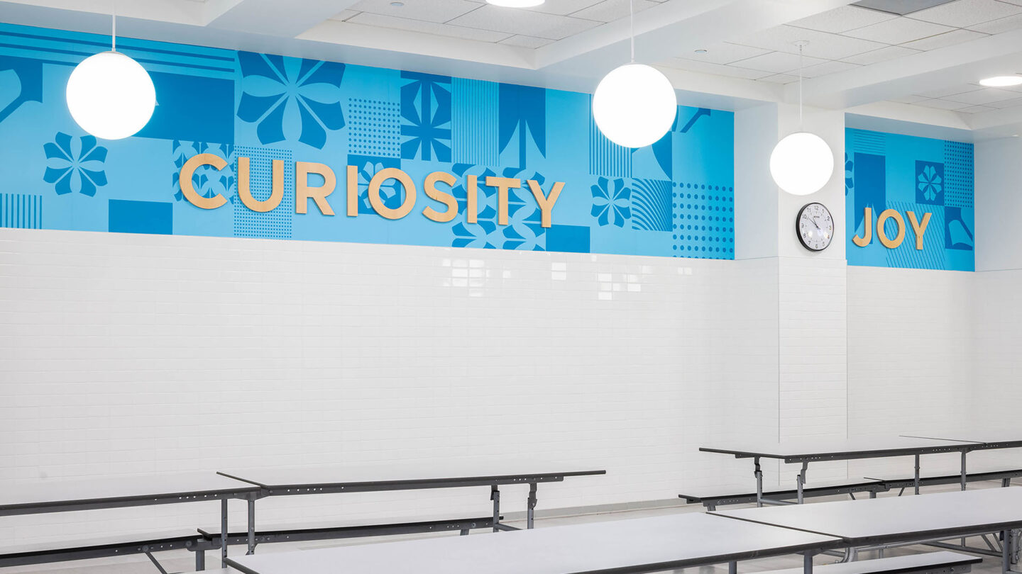 Dimensional letters and environmental graphics form a frieze around the cafetorium.