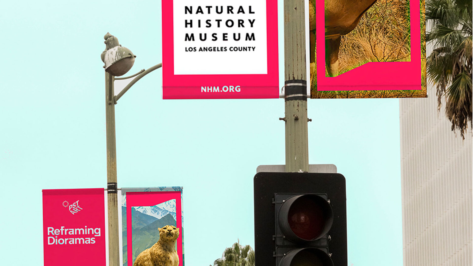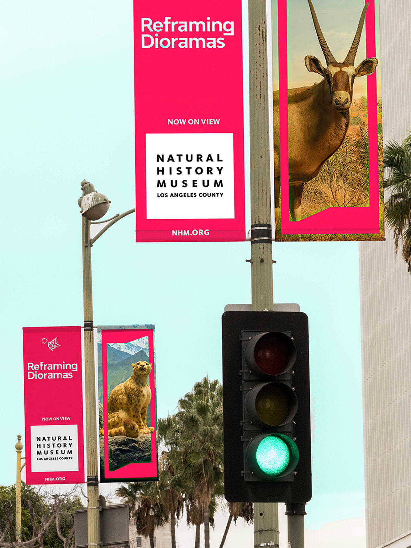 Traditional views of dioramas are reframed by bright magenta in a suite of promotional graphics that include street banners, wayfinding, and digital marketing.