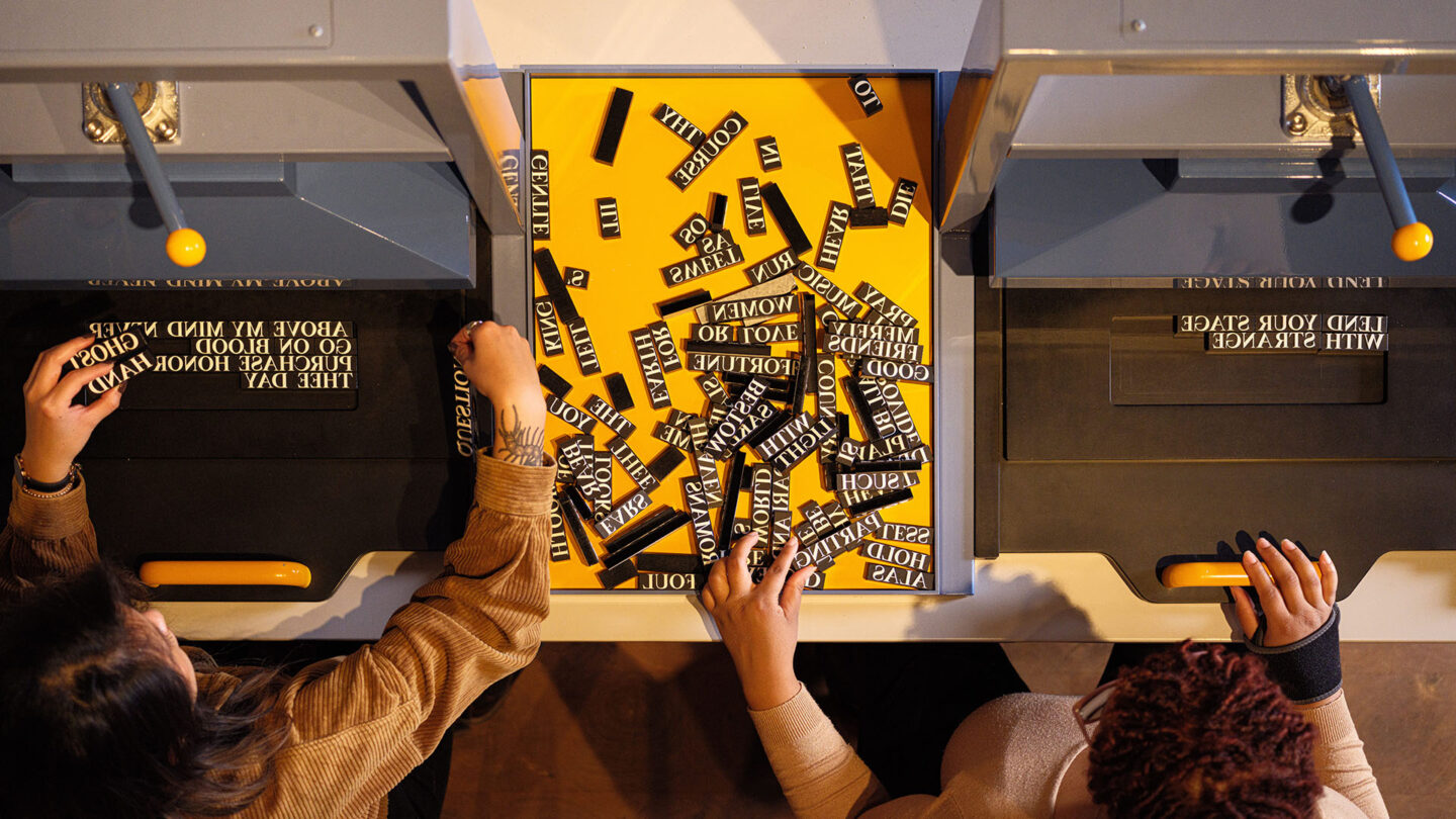 Printing with Light is a physio digital installation that reimagines the traditional printing press. Featuring two interactive printing stations with monitors, visitors assemble letter blocks on a surface, which are then scanned by computer vision technology. The selected text is projected digitally with a rich texture, mimicking the look of stamped ink. This experience blends physical interaction with digital artistry, allowing visitors to explore the art of printing, and some of Shakespeare’s most evocative language, in a modern, engaging way.