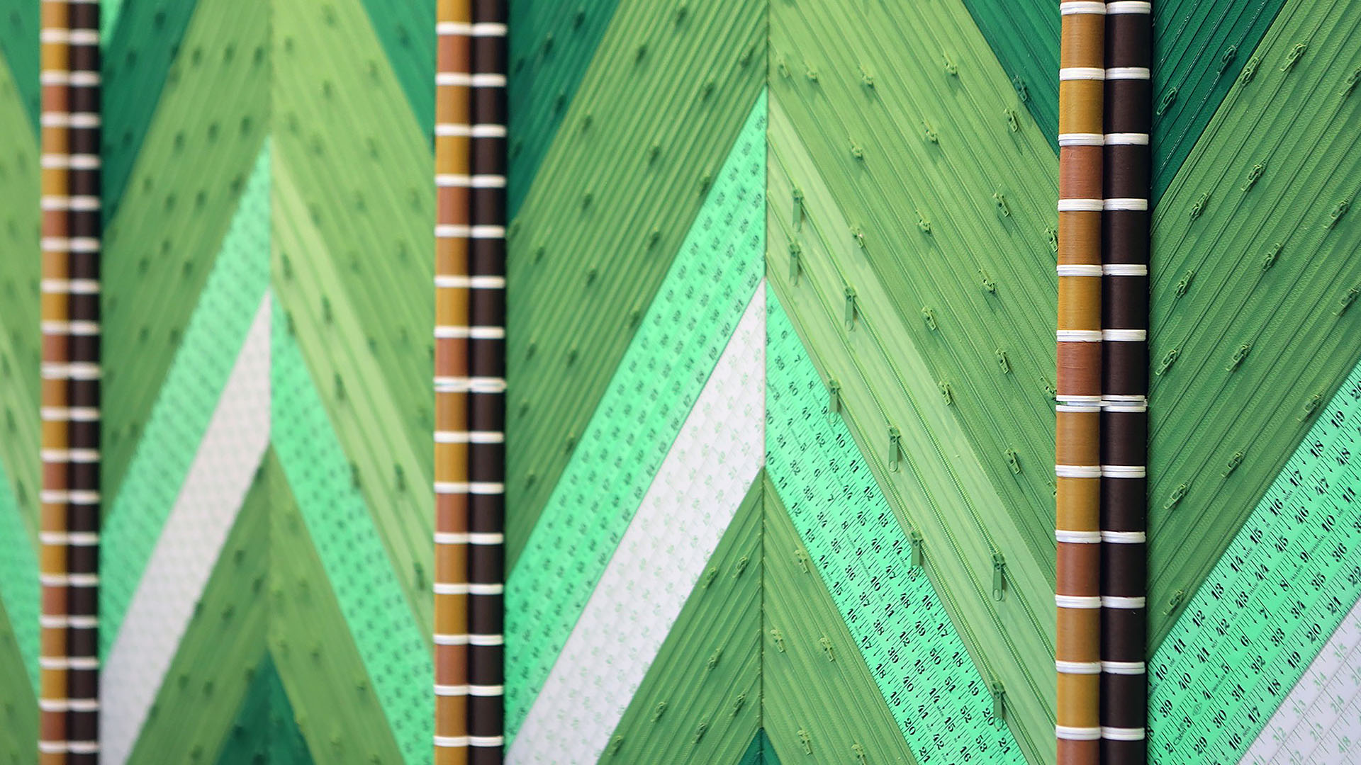 Pine needles are made of shades of green and white zippers with seamstress tapes. The spines are stacked spools of thread in 6 earth tone colors.