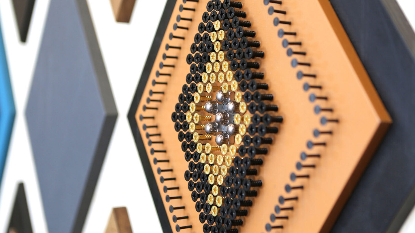 A demising scale of diamonds creates the illusion of volume with hardware, 6 grits and colors of sand paper, wood species, and duct tape. Trade professionals advised on legitimate materials.