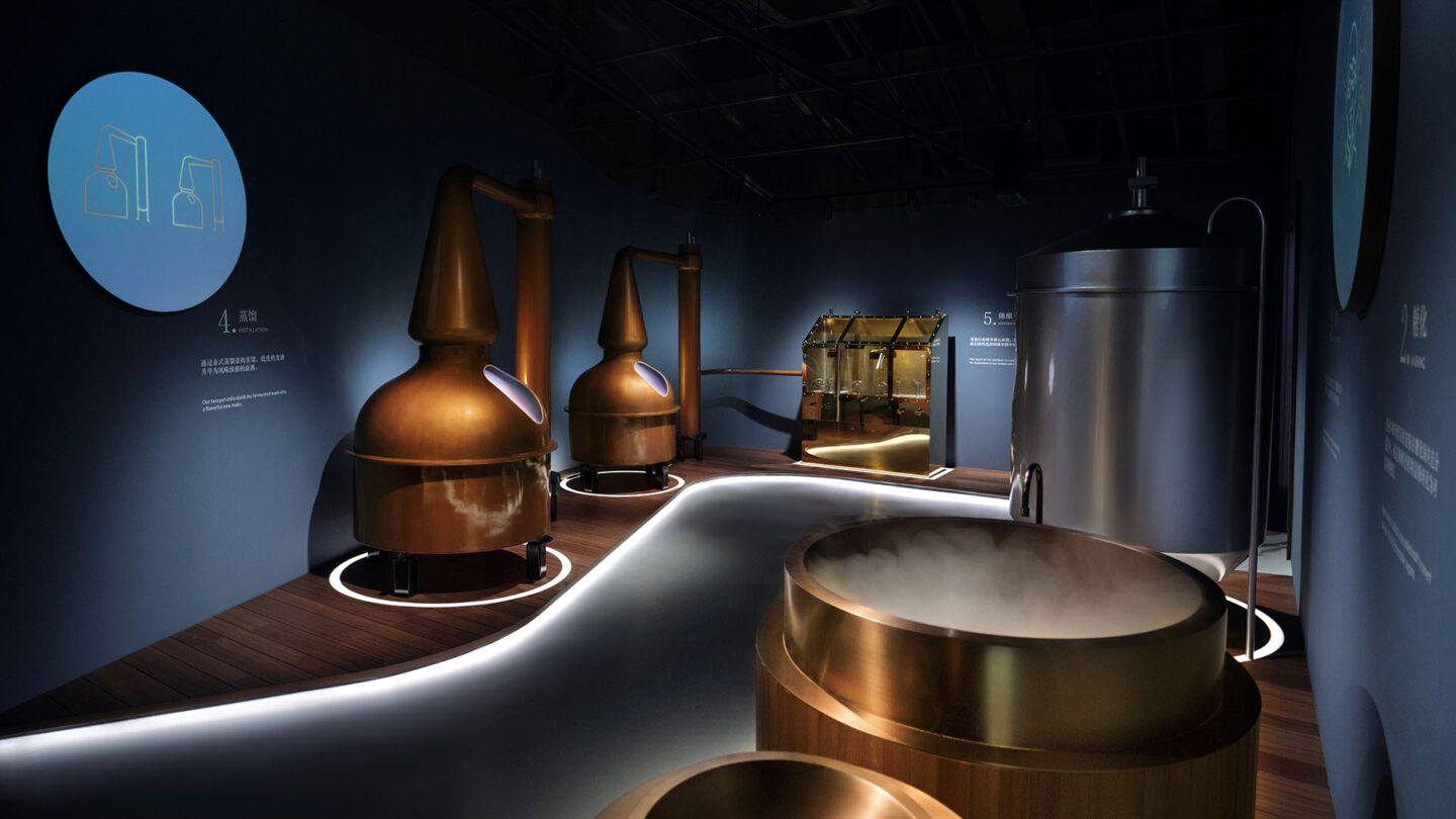 A multitude of distillery experiences created by BRC Imagination Arts emotionally engage Chinese, luxury clients and international visitors with enchantment and sensory delights. They enjoy spaces that evoke the atmosphere of a classic Chinese tea house—warm wood elements and meticulous attention to detail pay homage to Emeishan’s centuries-old teahouse traditions. These traditional elements harmonize with contemporary design features that reinterpret cultural heritage through a modern lens. The interplay of light and shadow, solid and void, creates spaces that feel at once ancient and timeless.