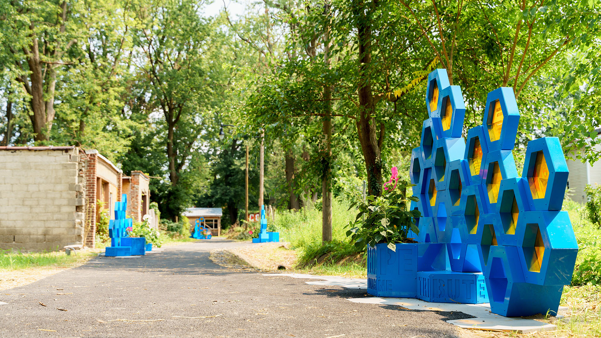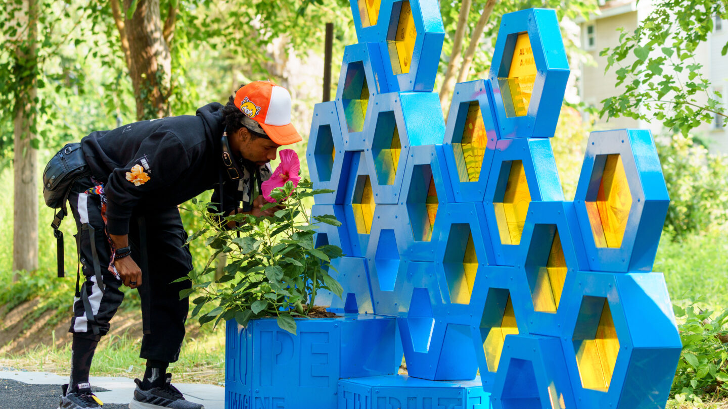 Each honeycomb structure also incorporates community-driven wayfinding, highlighting local assets such as the community garden, compost station, and farmers market. Additional features include a chess table, seating areas, performance and gathering spaces, and planters dedicated to remembering community members lost to gun violence. Words of aspiration, chosen by residents, are etched at the base of each structure to evoke positivity and hope.