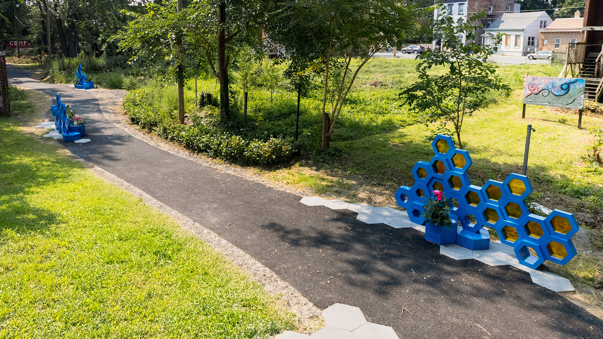 Because West Hill is a community deeply impacted by the traumas of gun violence, the project also sought to create a space of safety, reflection, and connection. In collaboration with Albany Victory Gardens, The Hive became part of a larger “green walk” that introduces neighbors to gardening and growing their own food. Community-driven wayfinding links the alley to the farmers market, blueberry orchard, and garden plots—connecting previously disparate but active sites of community life.