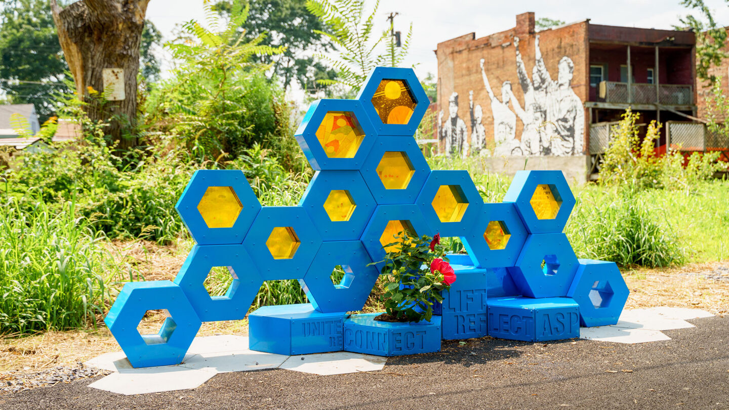 Inside the honeycomb elements is artwork created by the youth in the neighborhood. The artwork is